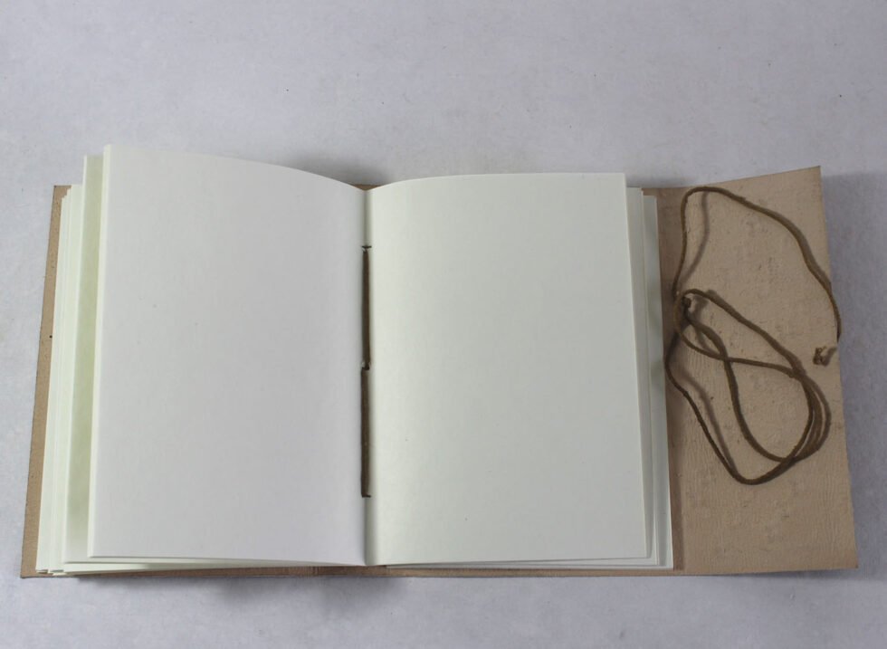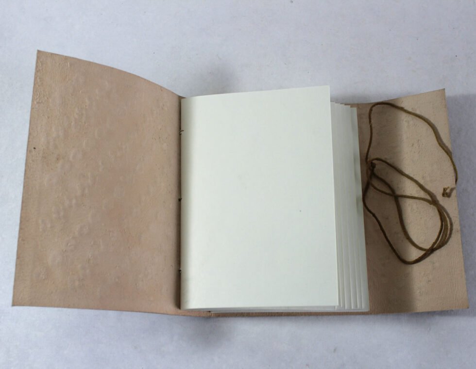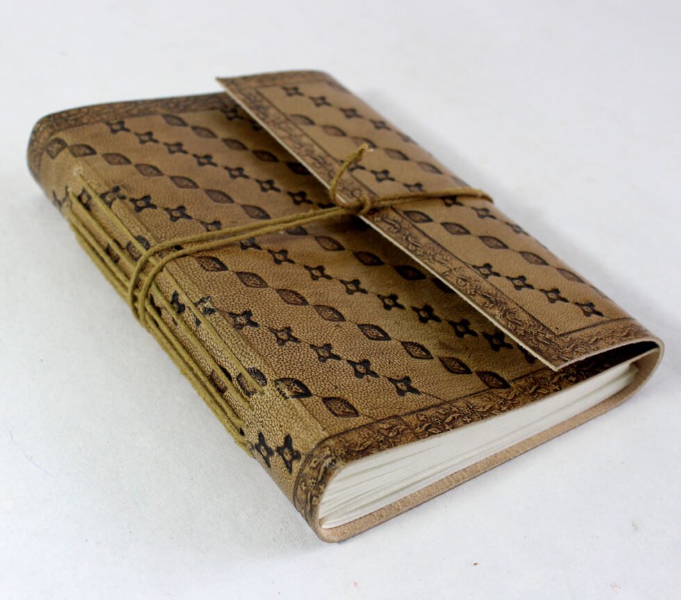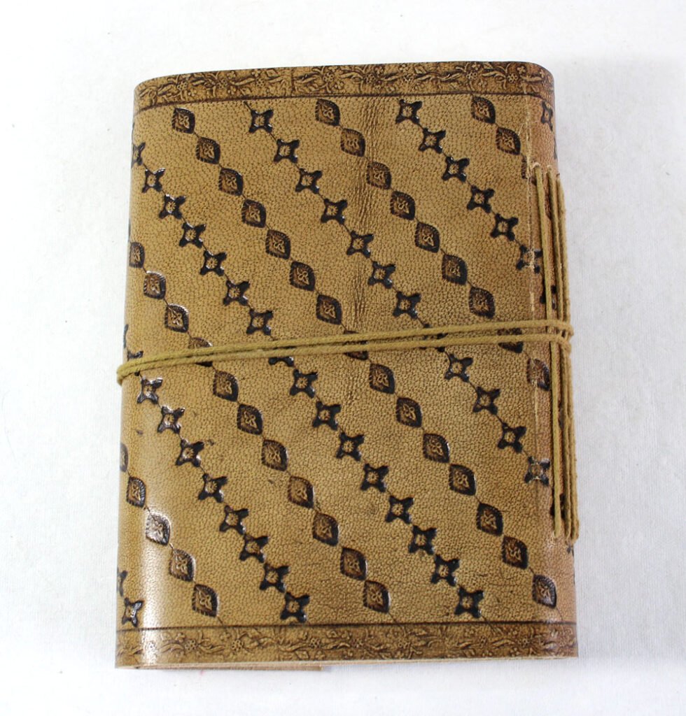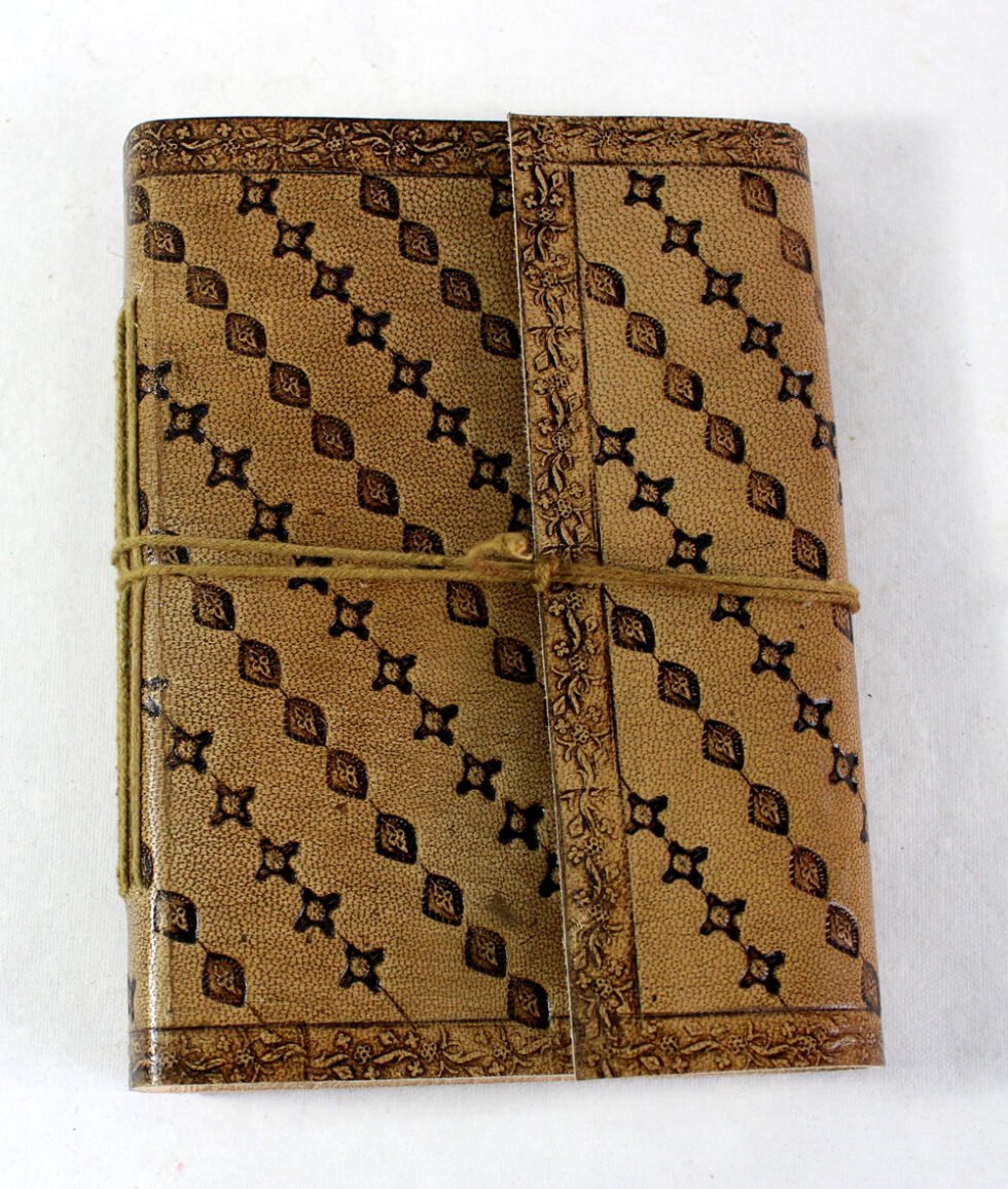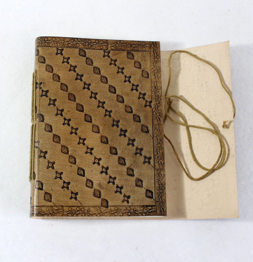 Finest quality of goat TC leather with an debossed design all over the leather cover. Later on the leather is water color dyed by expert artisans in a way that debossed design looks like ‘carved’ ones in antique fashion! The abrasion effect of leather cover makes the journal very exclusive! Inside is 72 cotton recycled paper sheets (144 pages) which is acid free, wood free and handmade. Never bleeds with ink pen!