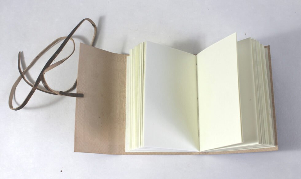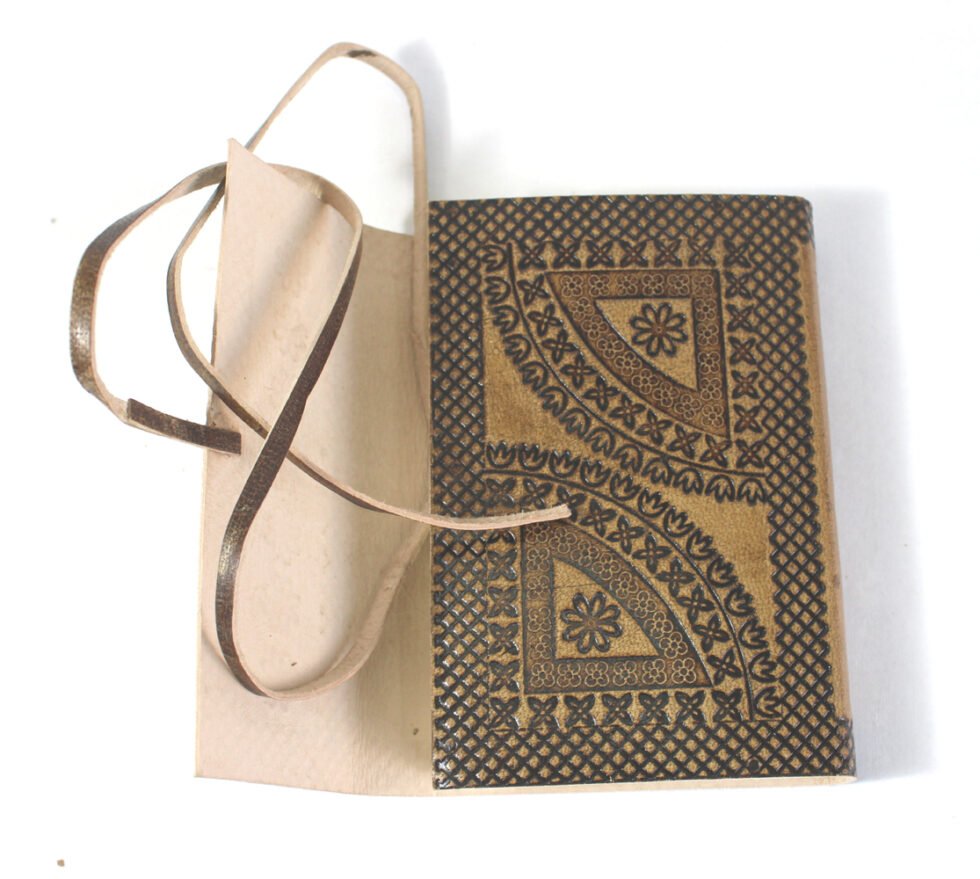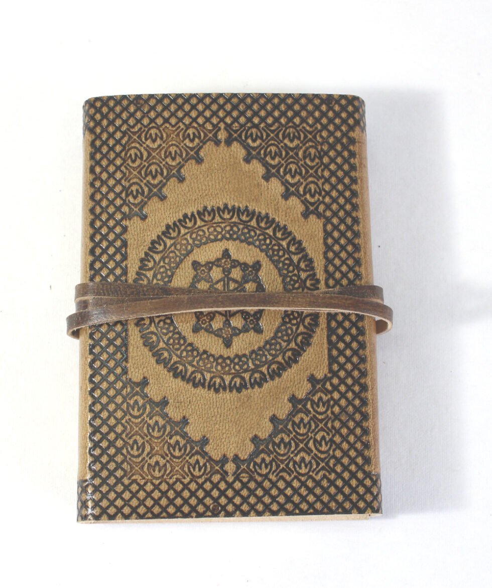 Finest quality of goat TC leather with an debossed design all over the leather cover. Later on the leather is water colour dyed by expert artisans in a way that debossed design looks like ‘carved’ ones in antique fashion! The abrasion effect of leather cover makes the journal very exclusive! Inside is 72 cotton recycled paper sheets (144 pages) which is acid free, wood free and handmade. Never bleeds with ink pen!