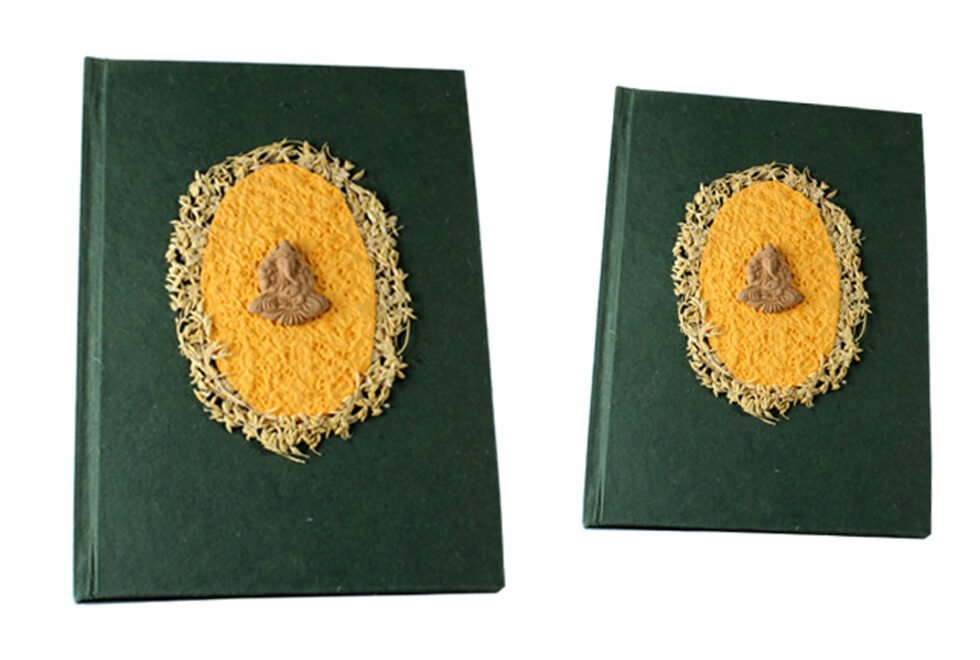 Set of 2 pcs A4/A5 beautiful collage design by gluing down a special paper in oval shape known as ‘Moon Rock’ on the front cover of the notebook. Further surrounded by the auspicious white grass around its border. In the centre, Lord Ganesha – The God of wisdom & Wealth, is placed, making it a very unique Diwali Present! A beautiful aesthetically made symbolic Diwali Present, and very auspicious too, for someone you wish very special! Just inside both the covers, front and back, there is another thick cream colour wood free / acid free paper sheet layer, holding the inside writing pages gracefully. In the middle, 48 sheets / 96 pages for smooth writing which never bleed with the ink or in calligraphy and can be a lovely travel book / art and craft book or a book – keeping domestic accounts and other valuable notes & details.