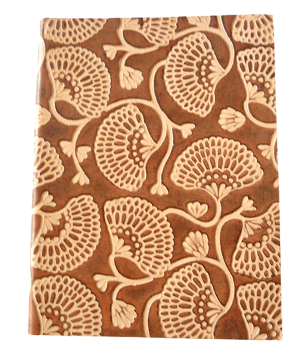 Finest quality of goat TC leather with an debossed design all over the leather cover. Later on the leather is water colour dyed by expert artisans in a way that debossed design looks like ‘carved’ ones! The abrasion effect of leather cover makes the journal very exclusive! Inside is 48 cotton recycled paper sheets (96 pages) which is acid free, wood free and handmade. Never bleeds with ink pen!