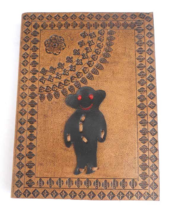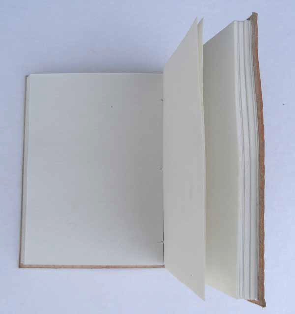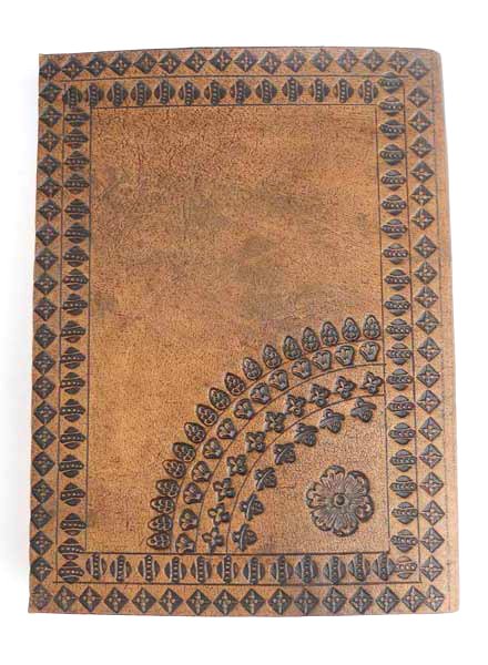 Finest quality of goat TC leather with an debossed design all over the leather cover. At the right center there is some collage work in leather. Later on the leather is water color dyed by expert artisans in a way that debossed design looks like ‘carved’ ones in antique fashion! The abrasion effect of leather cover makes the journal very exclusive! Inside is 72 cotton recycled paper sheets (144 pages) which is acid free, wood free and handmade. Never bleeds with ink pen!