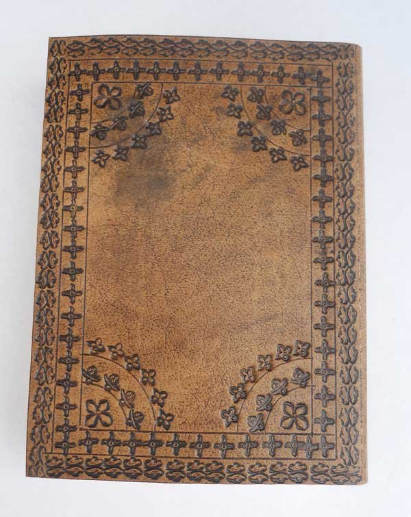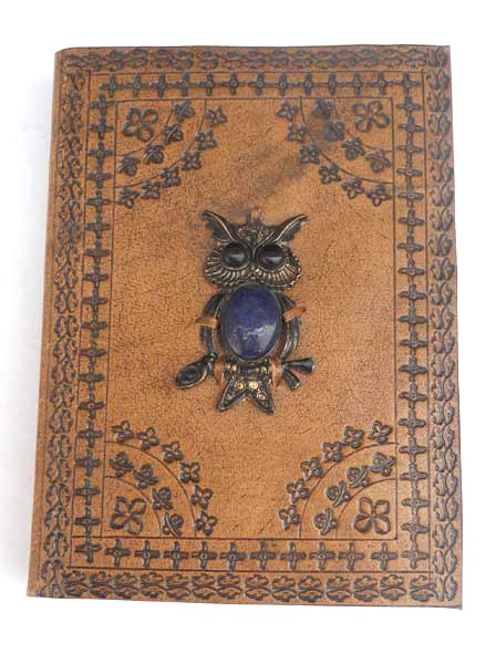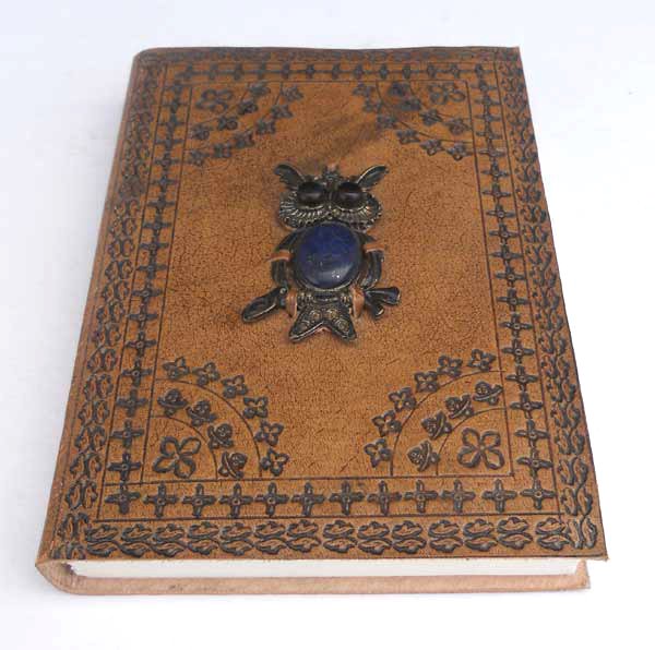 Finest quality of goat TC leather with an debossed design all over the leather cover. At the right center there is some collage work in brass & gem stoner. Later on the leather is water color dyed by expert artisans in a way that debossed design looks like ‘carved’ ones in antique fashion! The abrasion effect of leather cover makes the journal very exclusive! Inside is 72 cotton recycled paper sheets (144 pages) which is acid free, wood free and handmade. Never bleeds with ink pen!