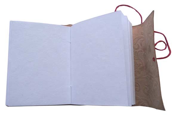 Finest quality of goat TC leather with an debossed design all over the leather cover. Later on the leather is water color dyed by expert artisans in a way that debossed design looks like ‘carved’ ones! The abrasion effect of leather cover makes the journal very exclusive! Inside is 72 cotton recycled paper sheets (144 pages) which is acid free, wood free and handmade. Never bleeds with ink pen!