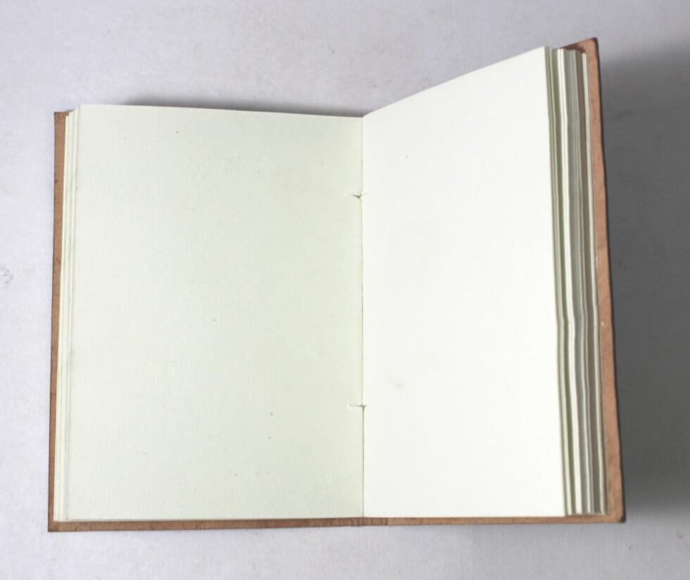 Goat TC leather embossed design all over. Later on the leather is dyed by expert artisans by pigment color giving it an ethnic effect. Inside is 72 cotton recycled paper sheets (144 pages) which is acid free, wood free and handmade. Never bleeds with ink pen !