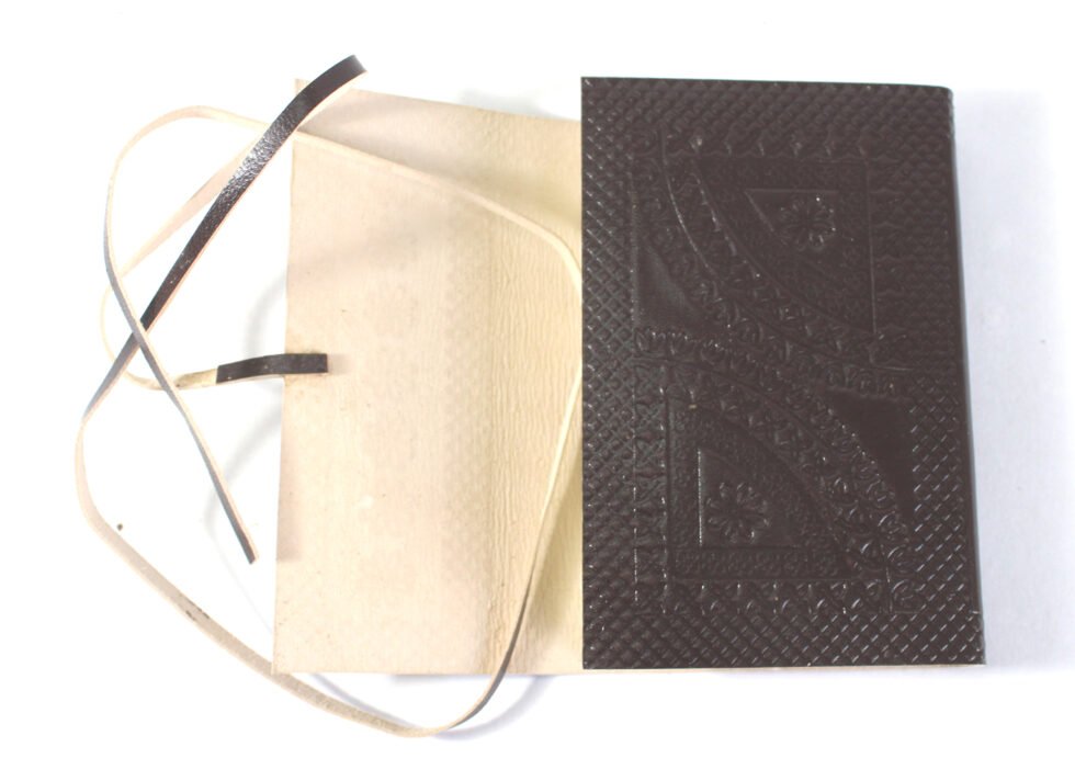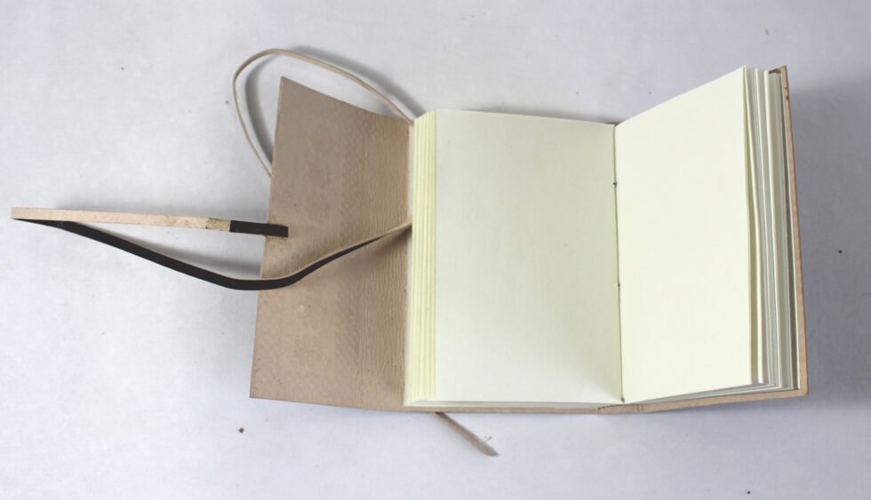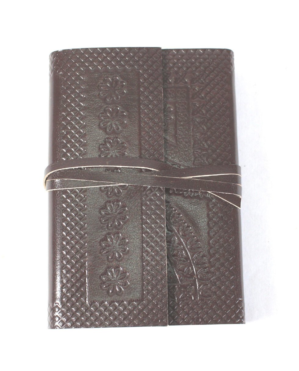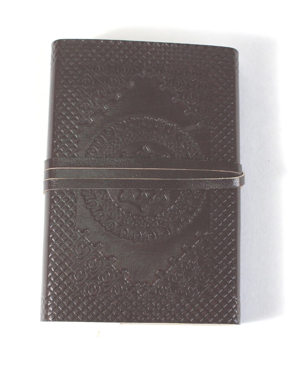 Goat TC leather embossed design all over. Later on the leather is dyed by expert artisans by pigment colours. Inside is 72 cotton recycled paper sheets (144 pages) which is acid free, wood free and handmade. Never bleeds with ink pen!