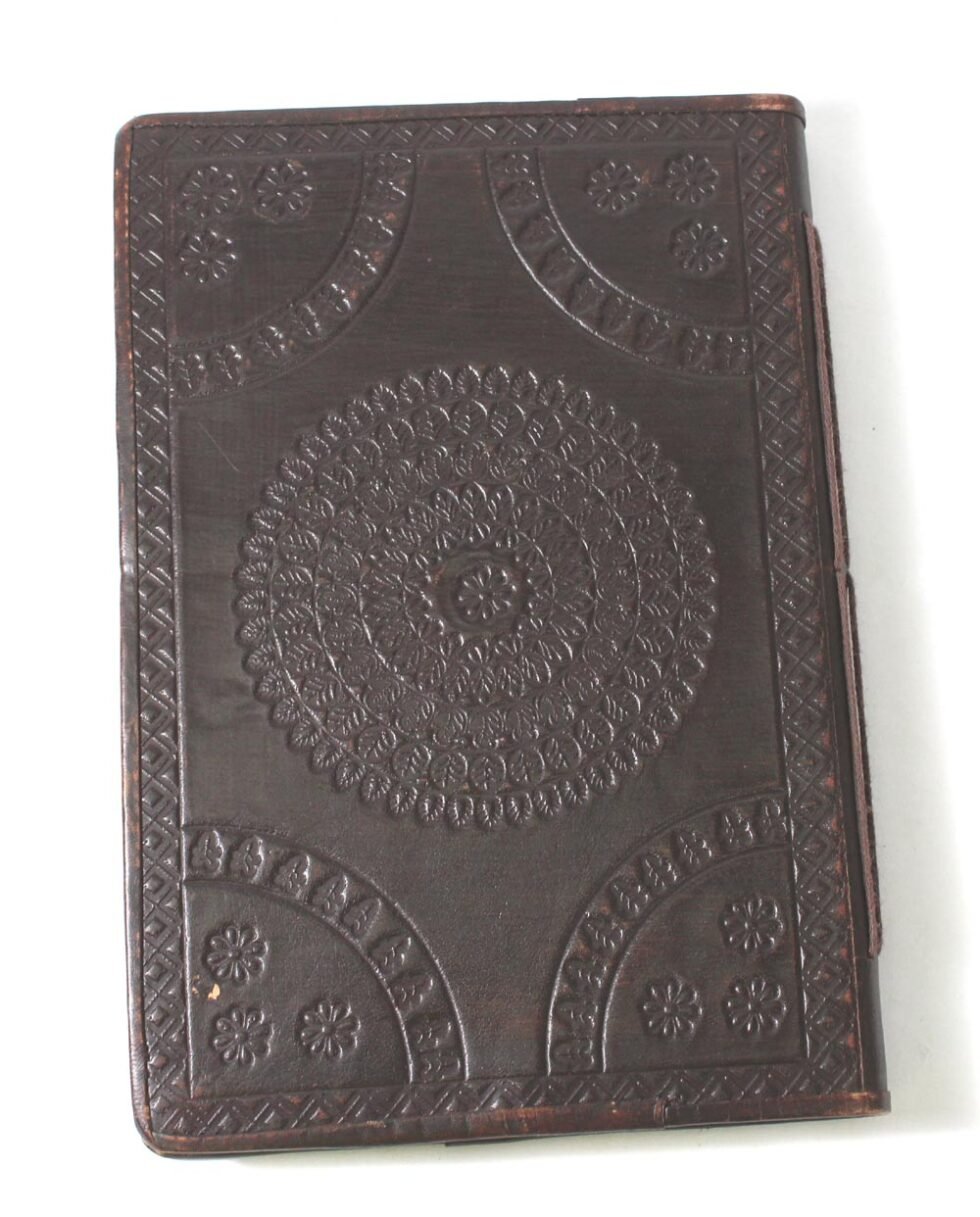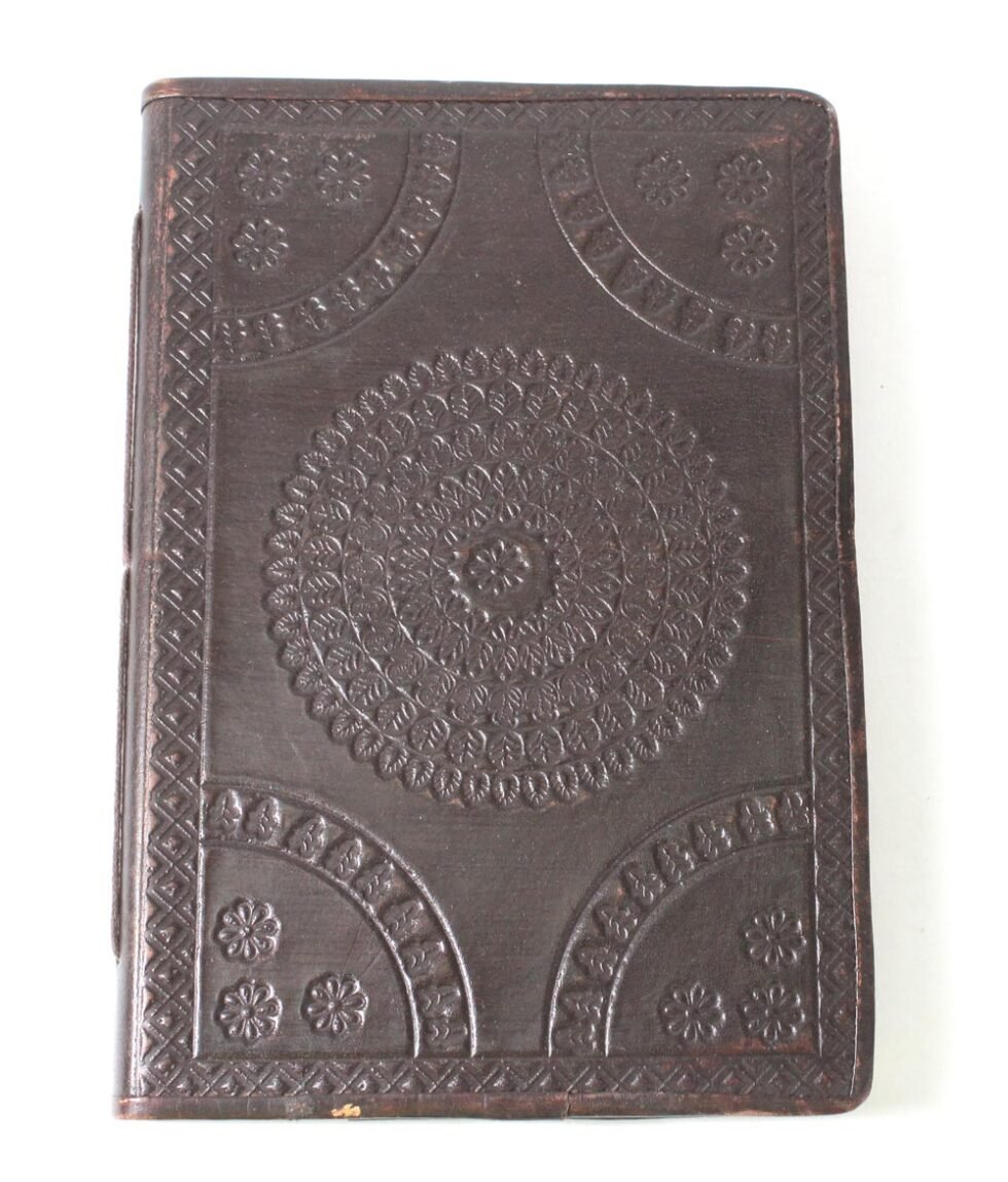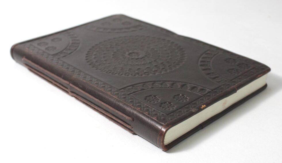 Goat TC leather embossed design all over. Later on the leather is dyed by expert artisans by water color giving it an abrasion effect. Inside is 72 cotton recycled paper sheets (144 pages) which is acid free, wood free and handmade. Never bleeds with ink pen!