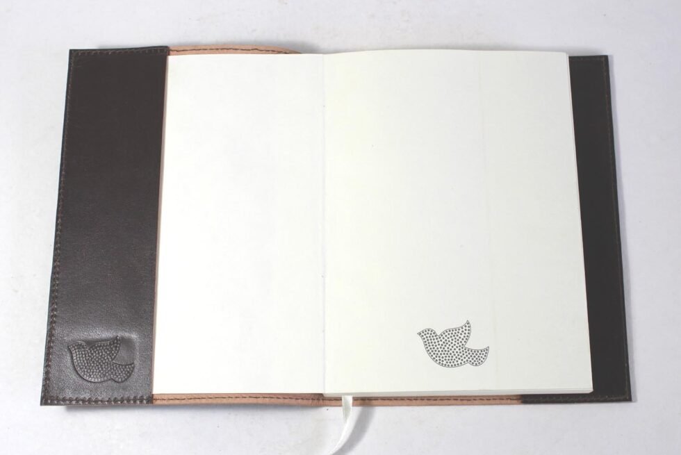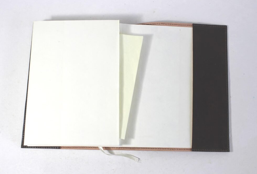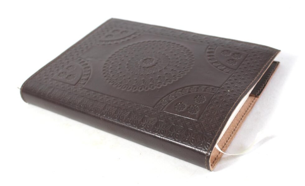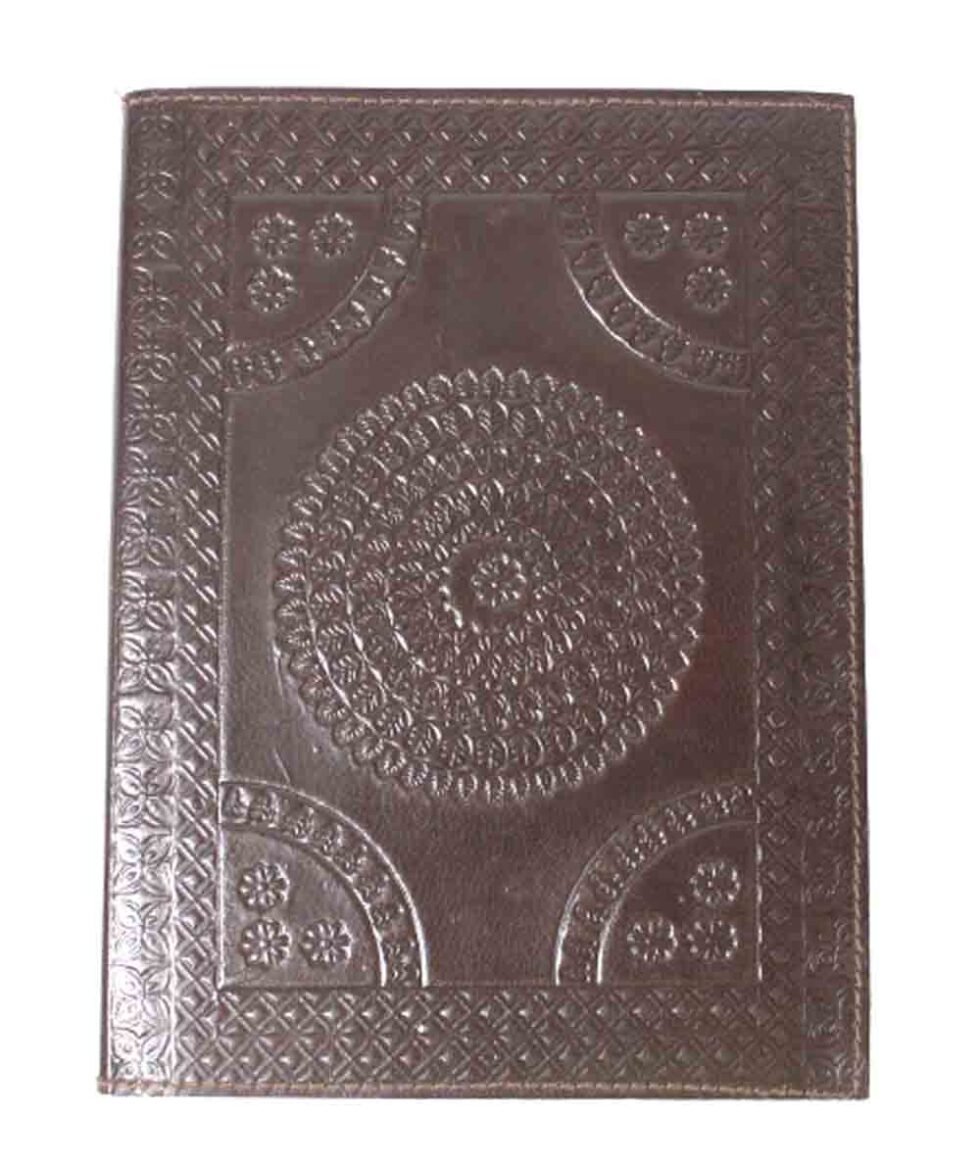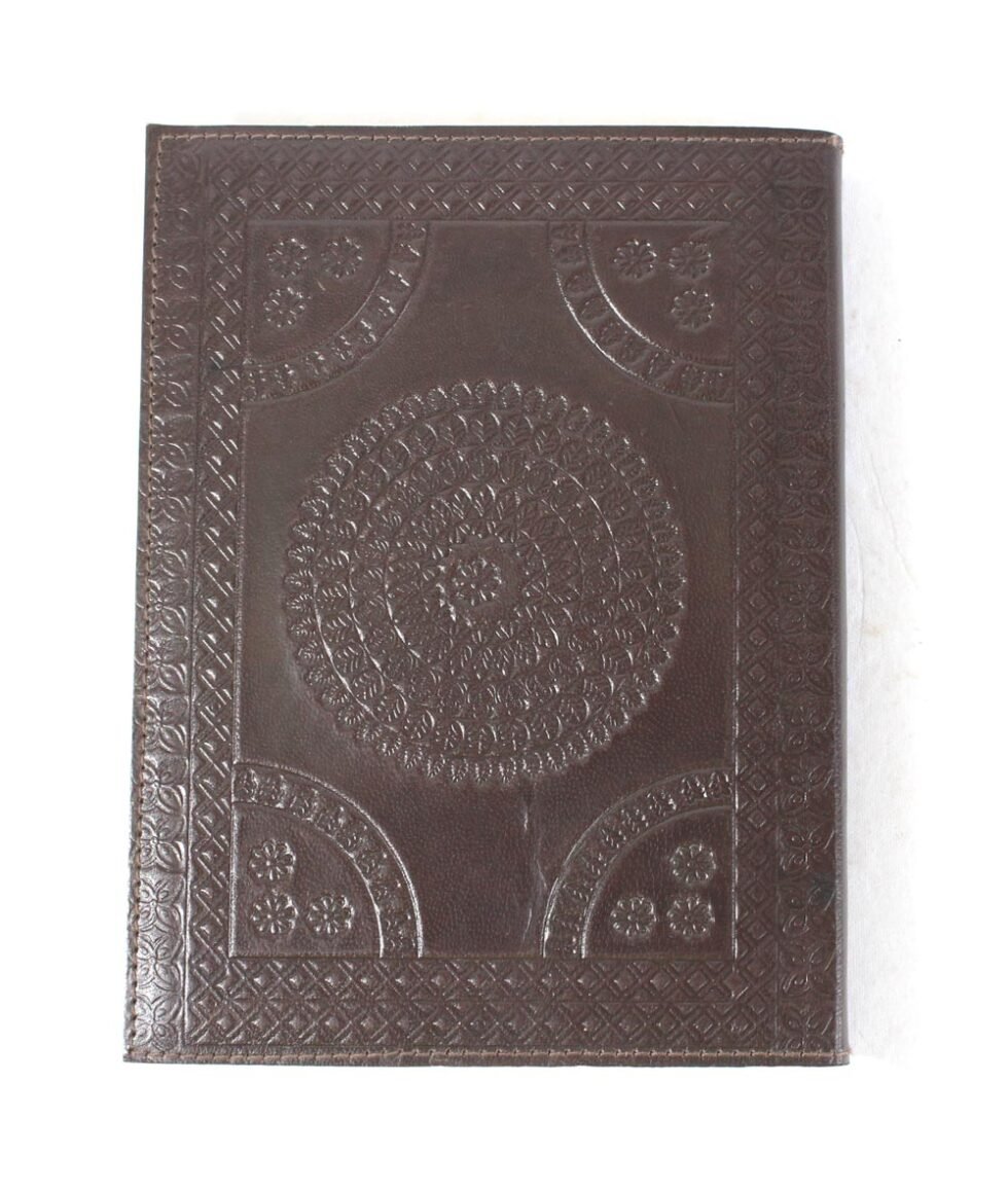 Goat TC leather embossed design all over. Later on the leather is dyed by expert artisans by pigment colours. A good customized journal with printed logo on the paper as well as embossed logo on the inside leather pocket. Inside is 72 cotton recycled paper sheets (144 pages) which is acid free, wood free and handmade. Never bleeds with ink pen!