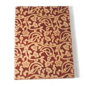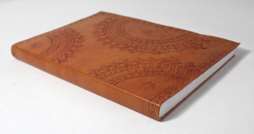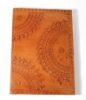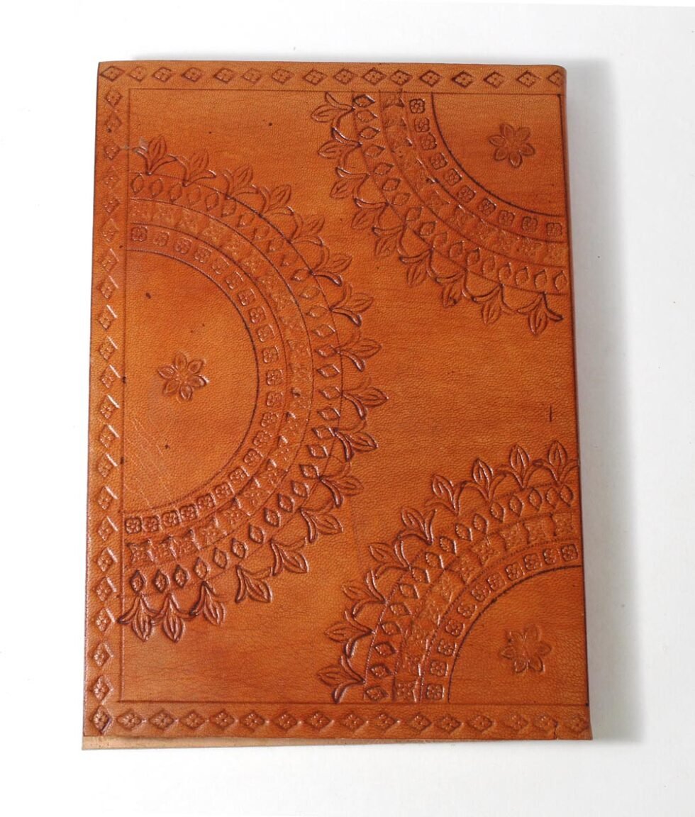 Goat TC leather embossed design all over. Later on the leather is dyed by expert artisans by pigment colours. A good customized journal with printed logo on the paper as well as embossed logo on the inside leather pocket. Inside is 72 cotton recycled paper sheets (144 pages) which is acid free, wood free and handmade. Never bleeds with ink pen!