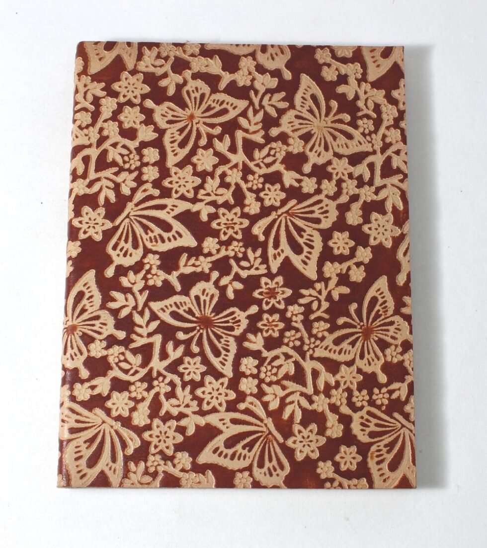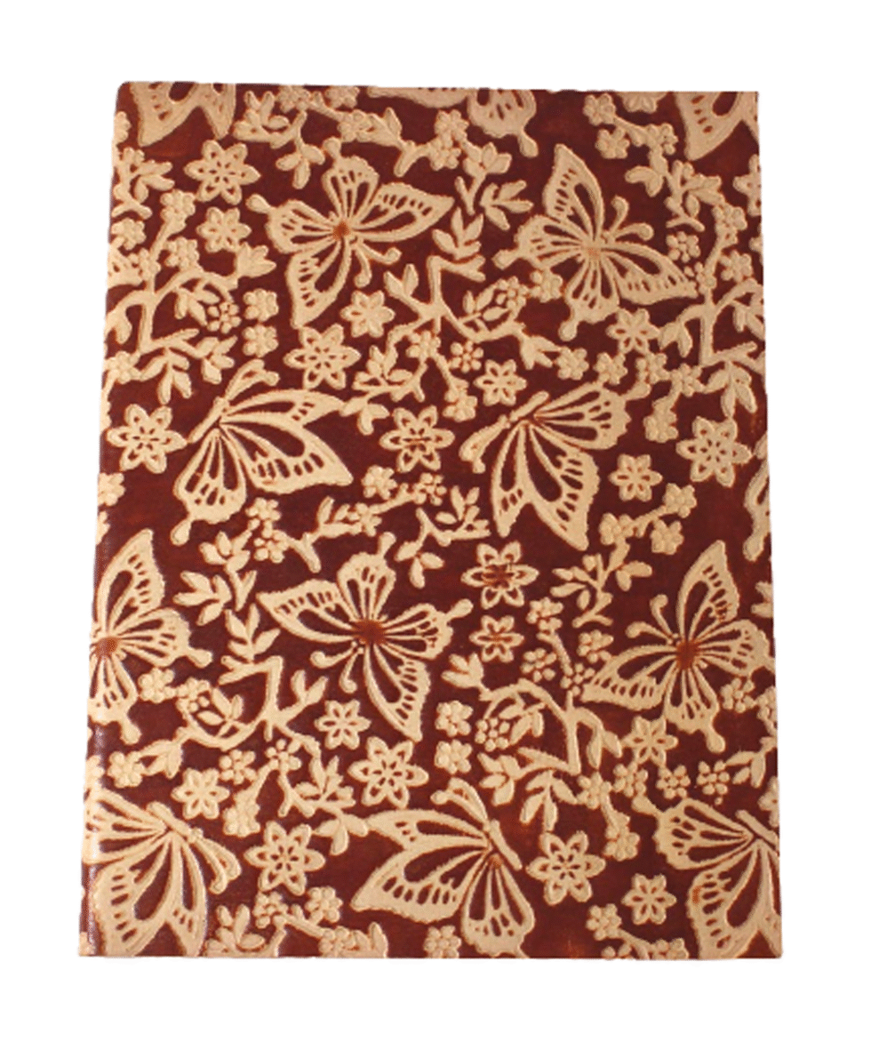 Finest quality of goat TC leather with an debossed design all over the leather cover. Later on the leather is water colour dyed by expert artisans in a way that debossed design looks like ‘carved’ ones! The abrasion effect of leather cover makes the journal very exclusive! Inside is 48 cotton recycled paper sheets (96 pages) which is acid free, wood free and handmade. Never bleeds with ink pen!