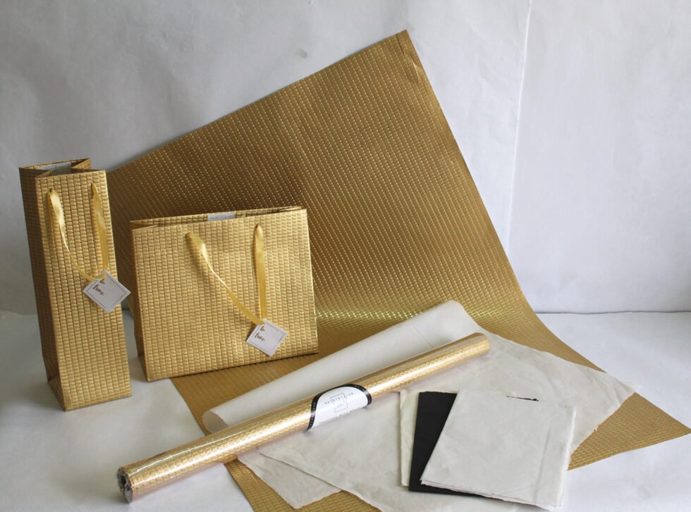 Golden metallic & foil print on 100 GSM recycled cotton paper. Wood fee, acid free handmade paper. A premium gift wrap for all kind of occasions rolled up on a paper tube. Can be shipped flat also, double folded or just flat. Can be supported by other packing accessories like bags, boxes, tissue papers, tags & labels – a wonderful packing range in environment friendly paper. Can definitely be customized in terms of sizes, colours, logo & other details.