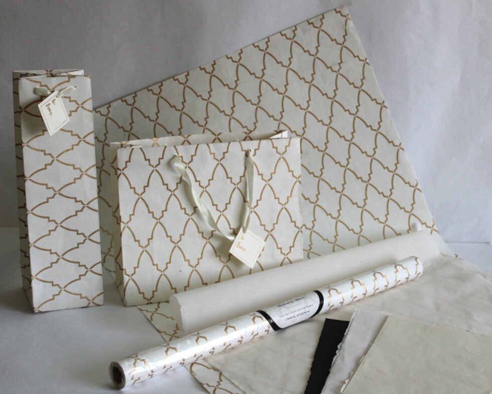 Golden metallic print on cream color 100 GSM recycled cotton paper. Wood fee, acid free handmade paper. A premium gift wrap for all kind of occasions rolled up on a paper tube. Can be shipped flat also, double folded or just flat. Can be supported by other packing accessories like bags, boxes, tissue papers, tags & labels – a wonderful packing range in environment friendly paper. Can definitely be customized in terms of sizes, colours, logo & other details.