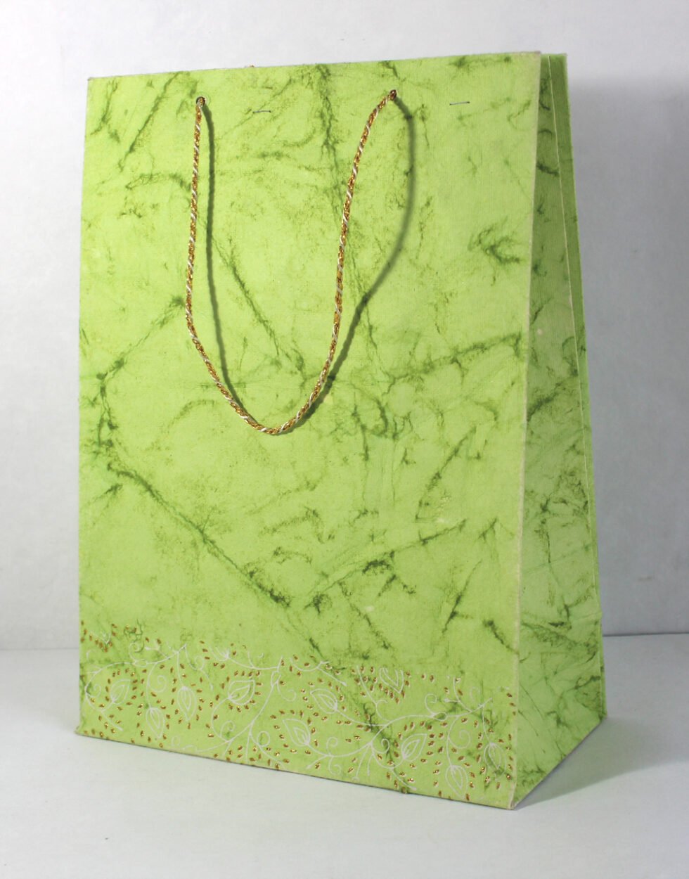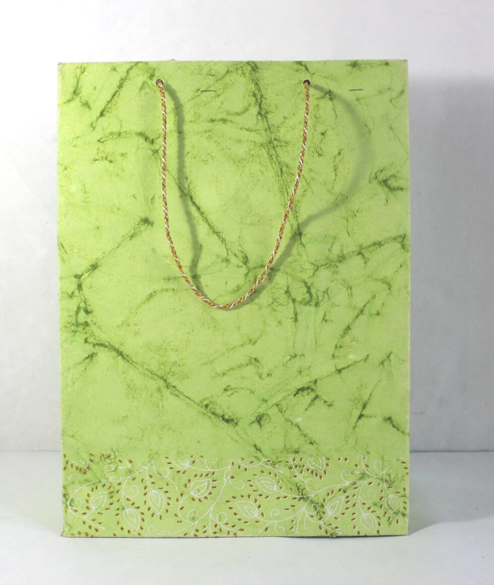 Recycled cotton handmade paper given batik print all over, while glitter and ink print around the bottom. Handles are matching golden string cords. To strengthen up the collars and bottom, separate card sheets inside those are given.