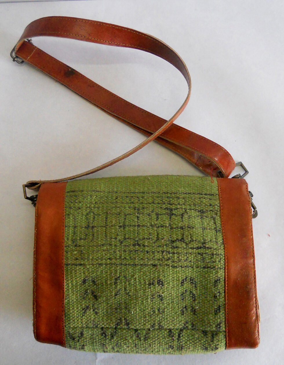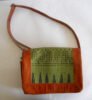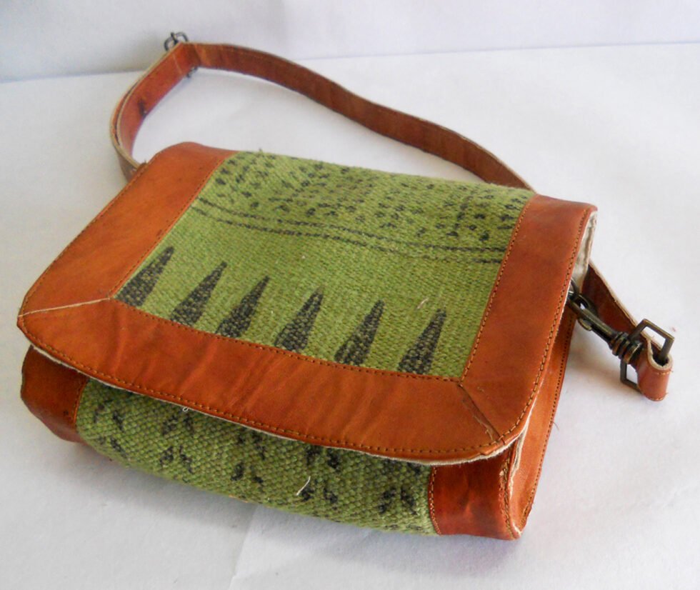Hand woven cotton kelim / dhurries hand bag with genuine leather used decoratively at the edges as piping. Inside is cotton fabric lining. For closure, a touch button is given. Tu rely ethnic product from the cottage industry of Thar Desert of Western India, Rajasthan.