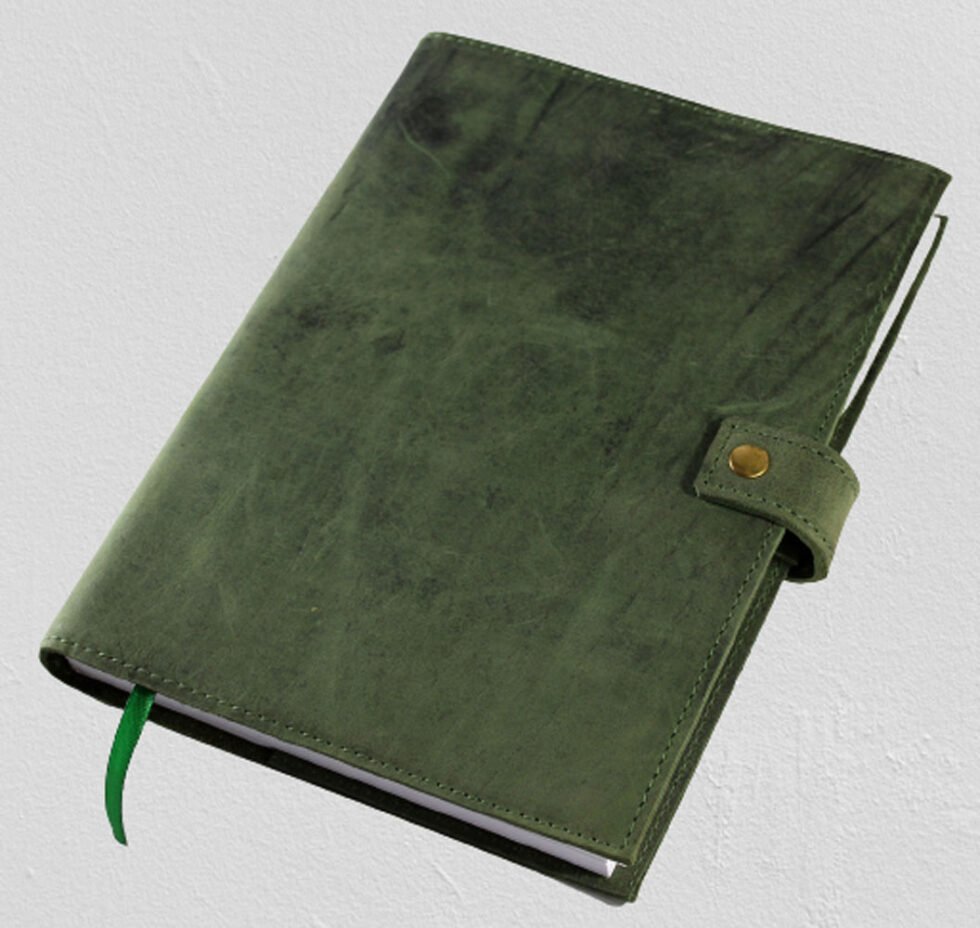 Genuine supple green natural buffalo leather journal with 100 sheets / 200 pages of mill made line print paper. A refillable journal once the inside papers are fully used up – as we do provide the same insert. Inside the front cover, a pocket for credit cards is give. At the back cover inside, a pen loop is provided with a small leather flap closure to protect the sheets inside. This journal is a special gift and a different kind of exclusive corporate gift!