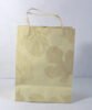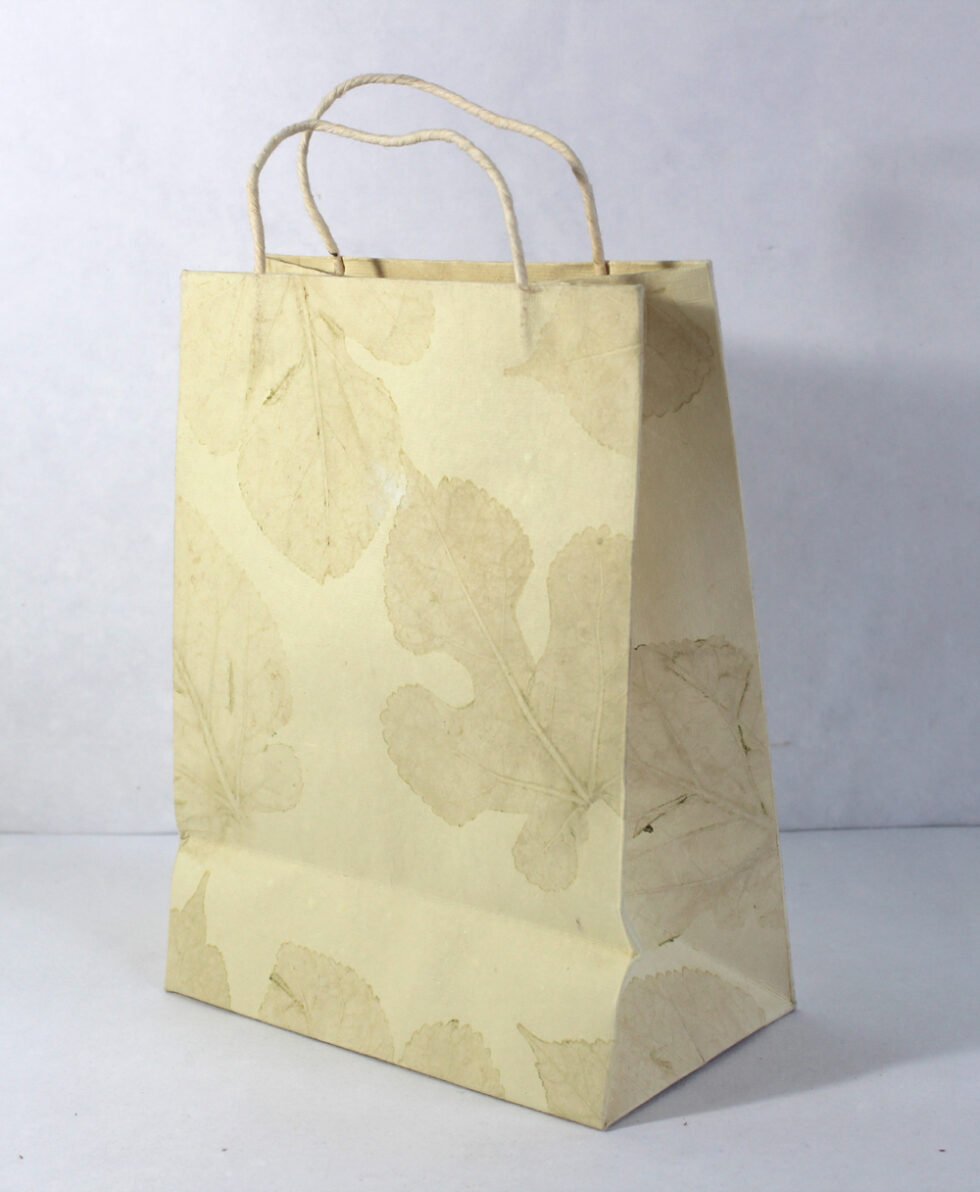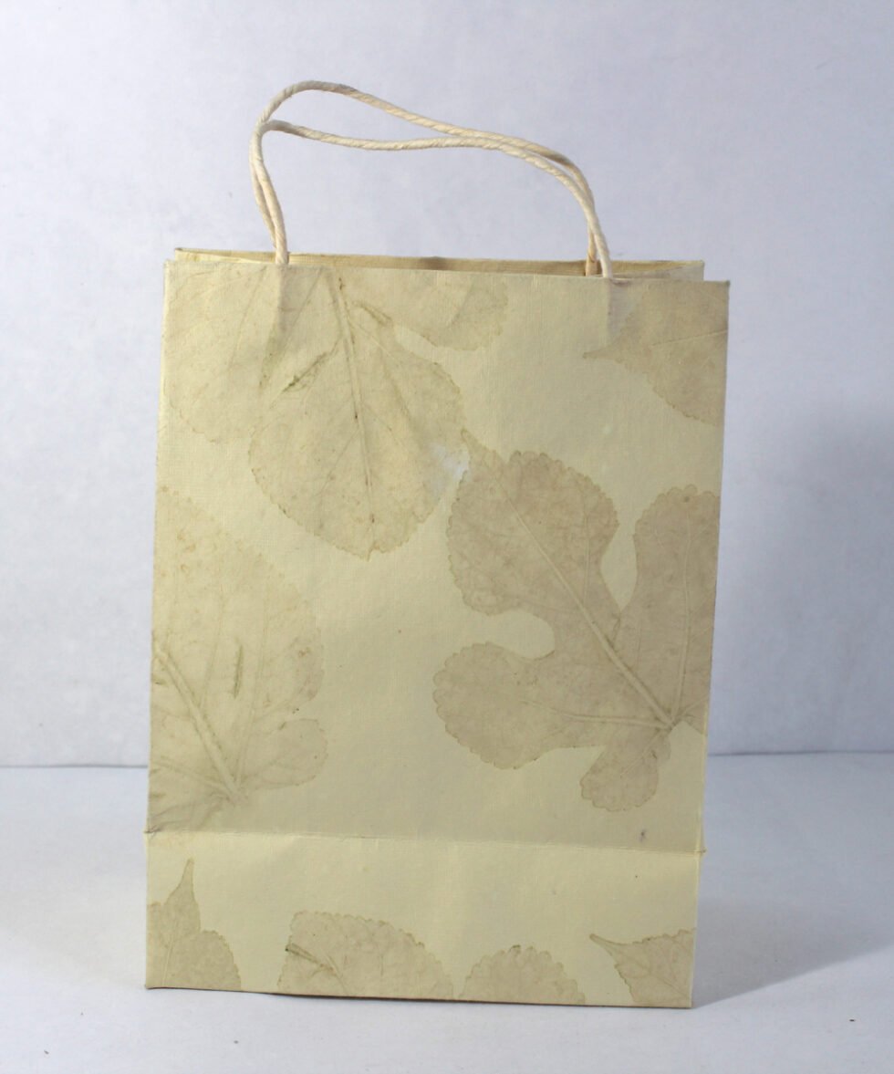 Green leaves impressions handmade cotton paper matching paper cord handles bag