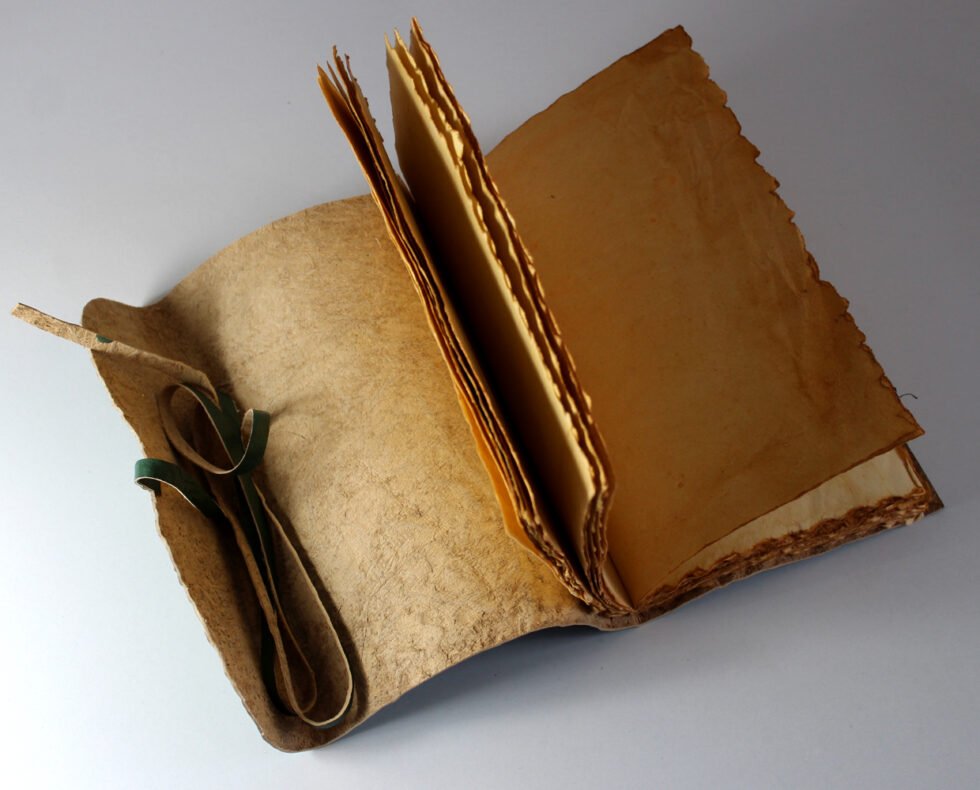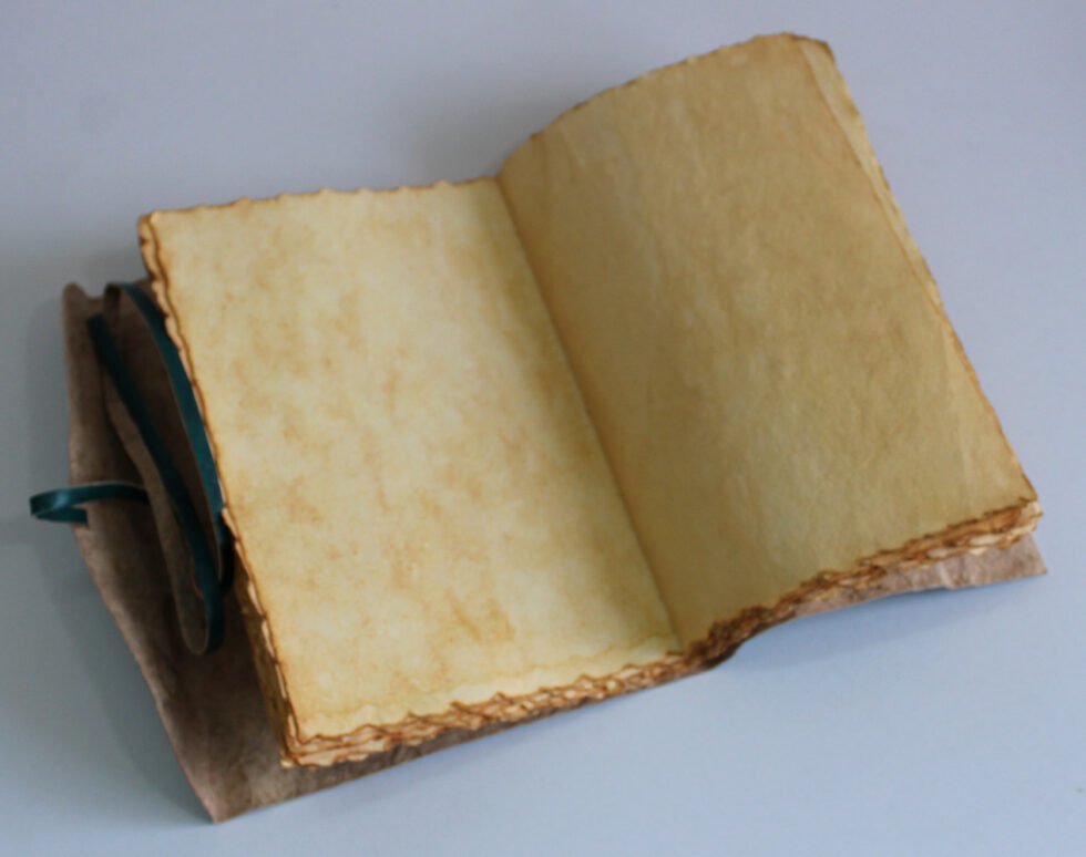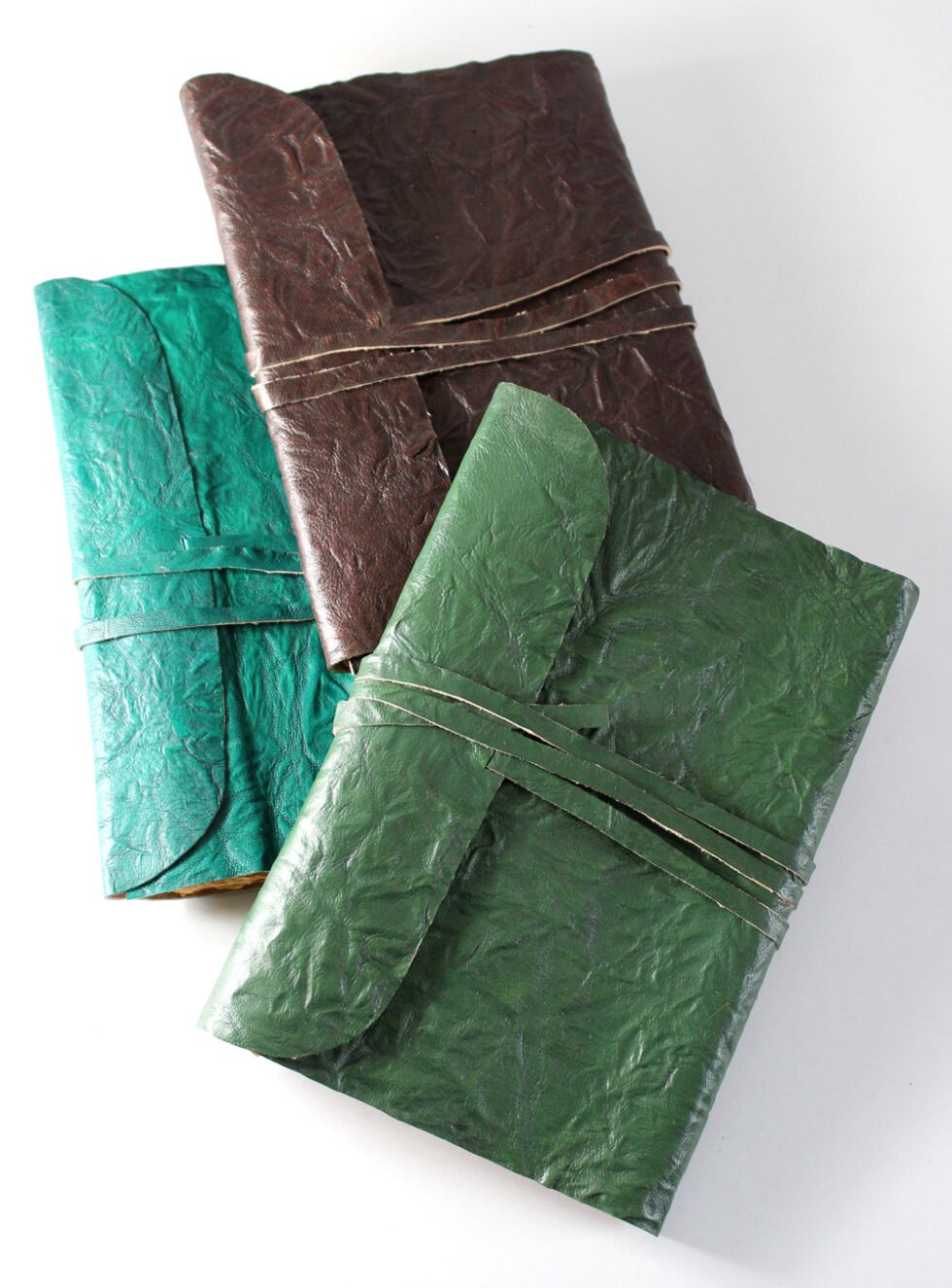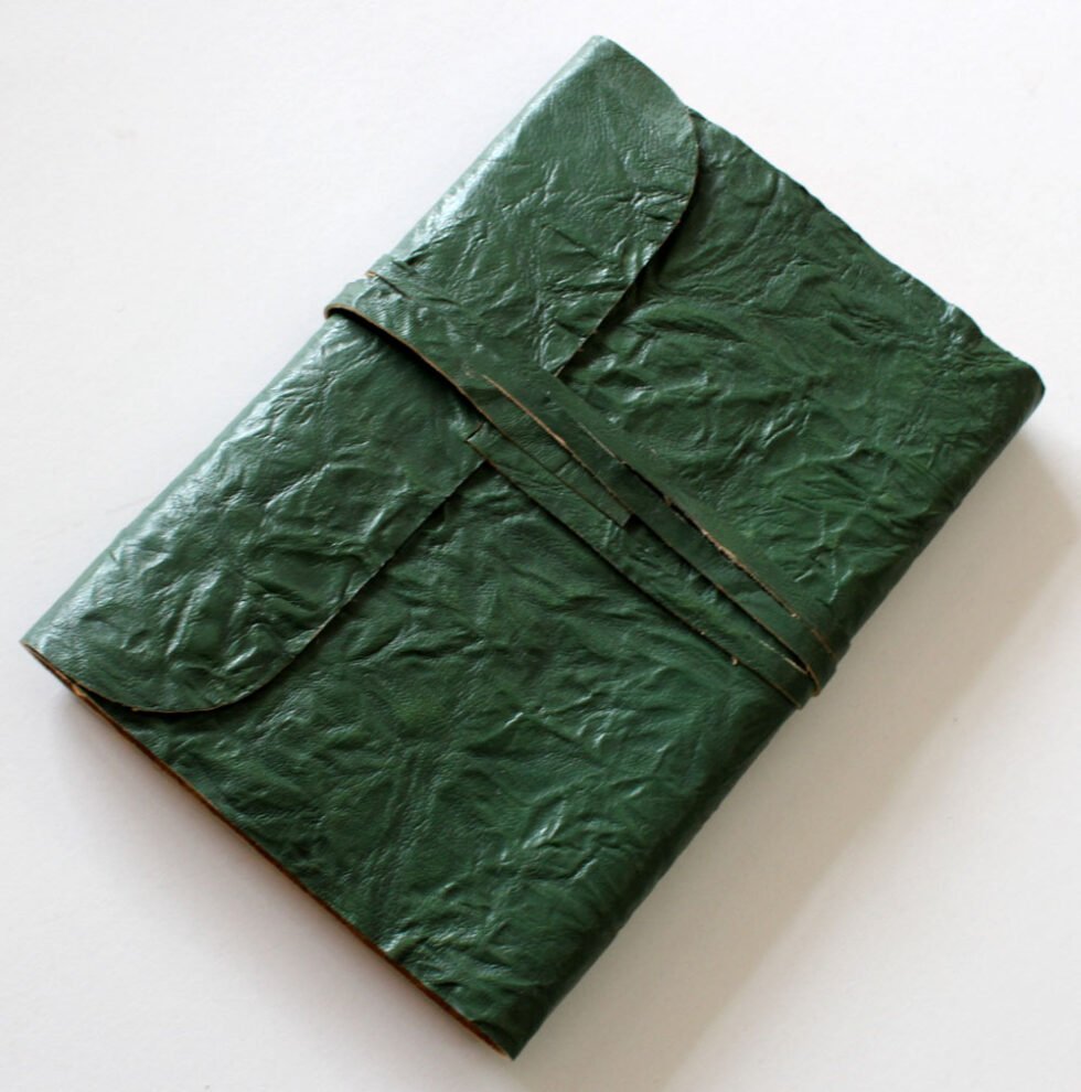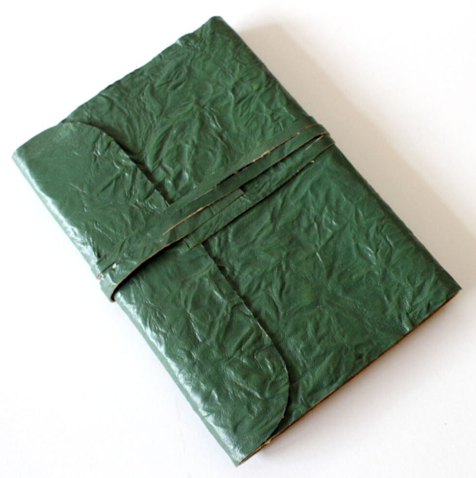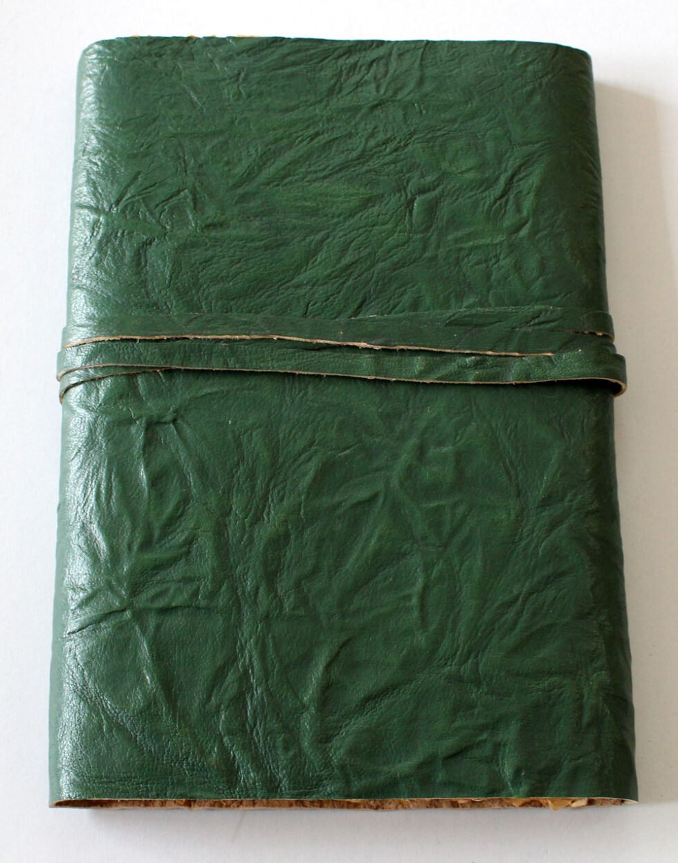 Green rustic style hard bound leather journal with antique looking recycled cotton paper – 25 sheets / 50 pages. Crinkled goat leather – color coated by village artisans on leather’s surface while the other side of the leather is natural shade! Excess leather flap and a leather strap around is given for the safe closure of this vintage journal.