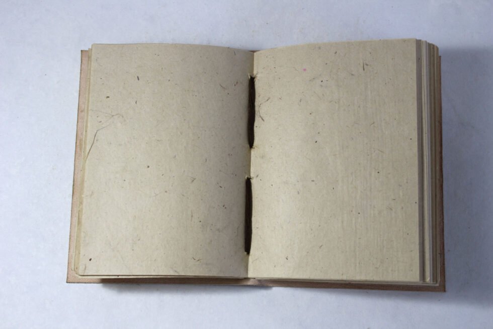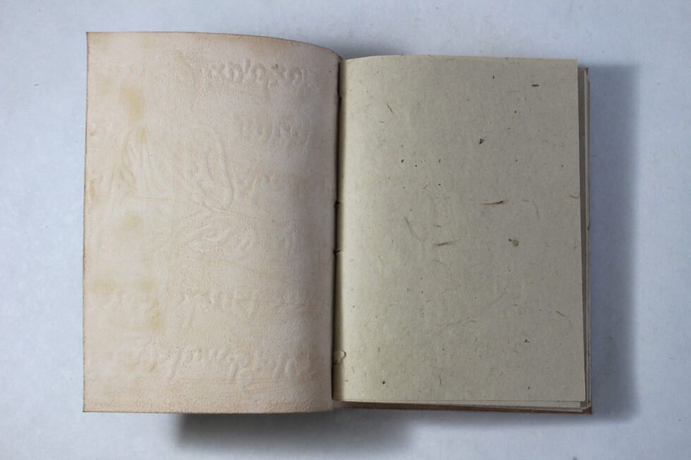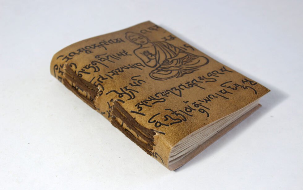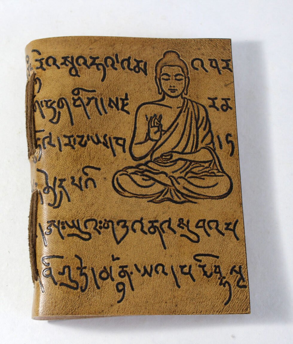 Hand bound goat leather journal in antique color and finish. Hand crafted journal having Buddha and some antique scripts embossed on the front cover. Inside is 100 sheets / 200 pages of ‘lokta Paper’ in natural shade of 70 GSM. Since centuries, this paper has been used in Buddhist monasteries high in Himalayas! Excellent paper to write upon which never bleeds with ink or even in painting! Truly recycled paper, handmade paper, wood free paper – with Ph level 7 or higher – its an acid free paper too!