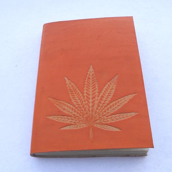 Hand bound goat leather journal in orange color. Hand crafted journal with hemp leaf embossed on the front cover. Inside is 48 sheets / 96 pages of ‘Hemp Paper’ in natural shade of 70 GSM. Excellent paper to write upon which never bleeds with ink or even in painting! Truly recycled paper, handmade paper, wood free paper – with Ph level 7 or higher – its an acid free paper too!