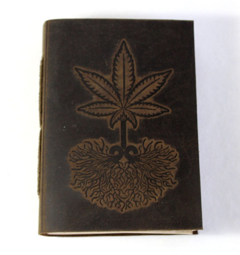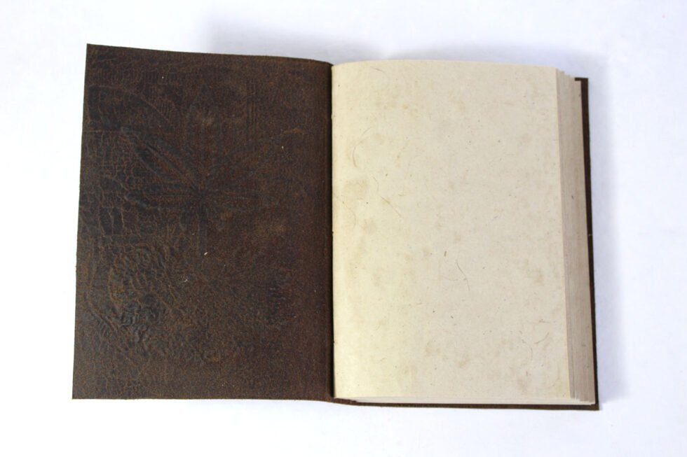 Hand crafted buffalo leather hand bound journal with cotton threads in antique color. Hemp leaf and roots embossed on the front cover. Inside is 100 sheets / 200 pages of ‘hemp paper’ in natural shade of 70 GSM. Excellent paper to write upon which never bleeds with ink or even in painting! Truly recycled paper, handmade paper, wood free paper – with Ph level 7 or higher – its an acid free paper too!