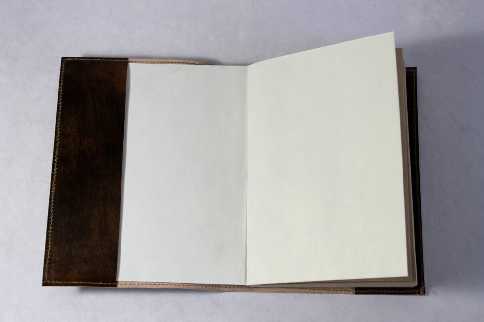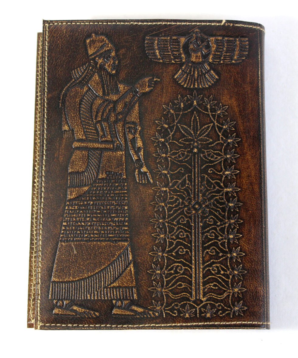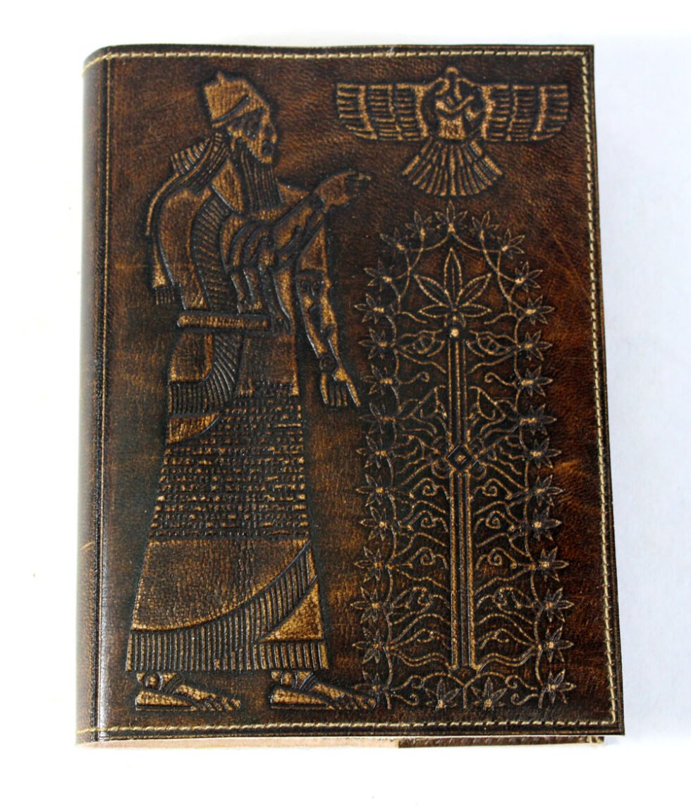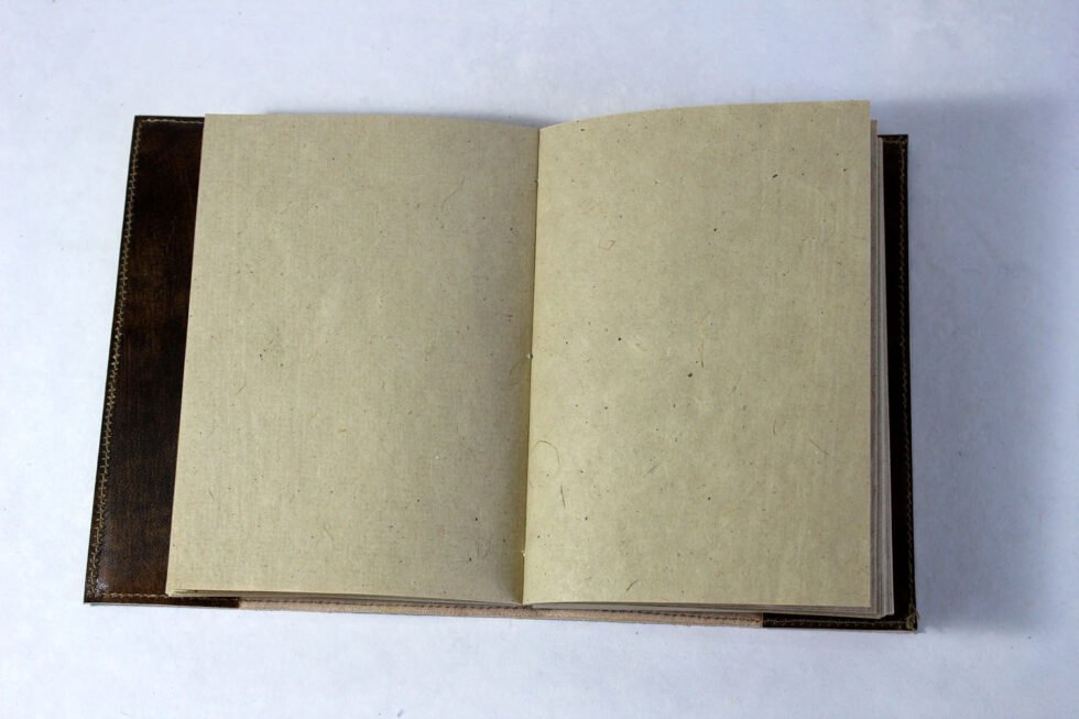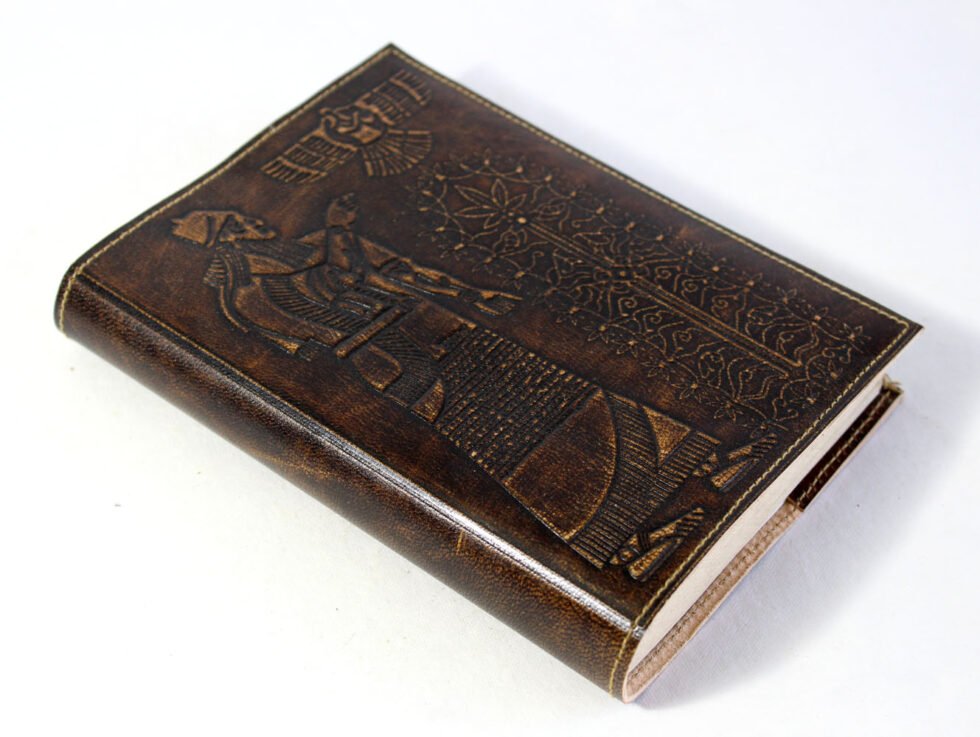Hand crafted goat leather refillable journal in antique color and finish. Front embossed design is from Sumerian inscription showing Tree of Life and hemp leaves around it! In Sumerian Civilization, hemp was used! Inside is 100 sheets / 200 pages of ‘Hemp Paper’ in natural shade of 70 GSM. Excellent paper to write upon which never bleeds with ink or even in painting! Truly recycled paper, handmade paper, wood free paper – with Ph level 7 or higher – its an acid free paper too!