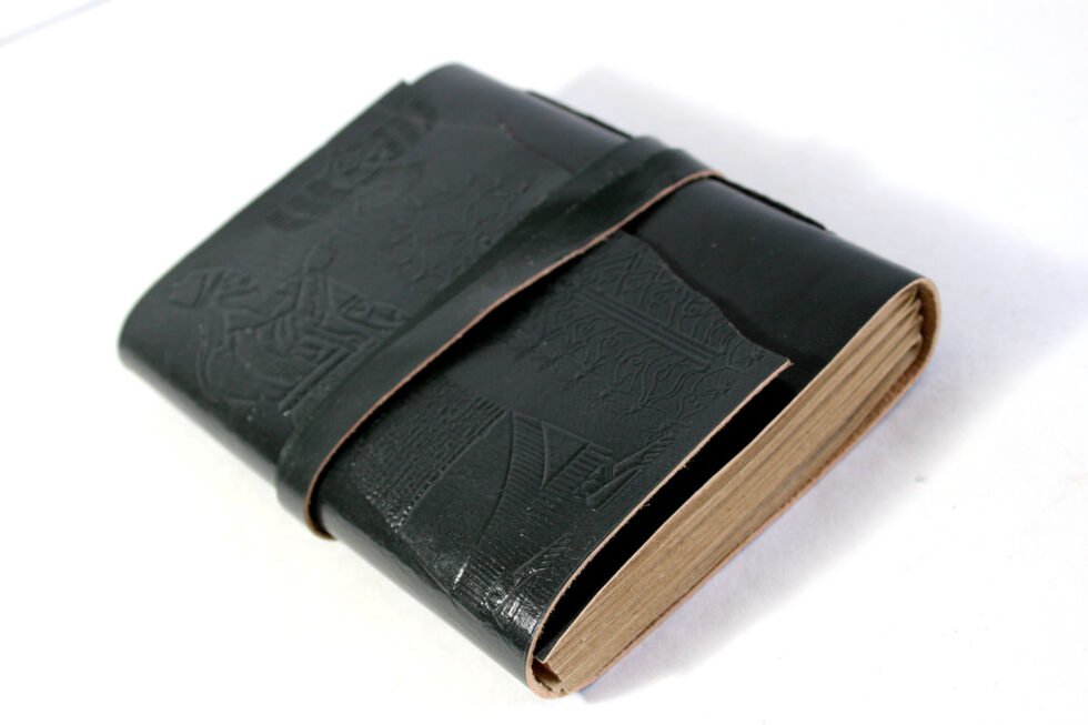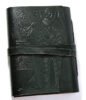Hand crafted gypsy style wrap around goat leather journal in black. Hand bound with matching cotton thread. Front embossed design is from Sumerian inscription showing Tree of Life and hemp leaves around it! In Sumerian Civilization, hemp was used. Inside is 100 sheets / 200 pages of ‘Hemp Paper’ in natural shade of 70 GSM. Excellent paper to write upon which never bleeds with ink or even in painting! Recycled paper, handmade paper, wood free paper – with Ph level 7 or higher – its an acid free paper too!