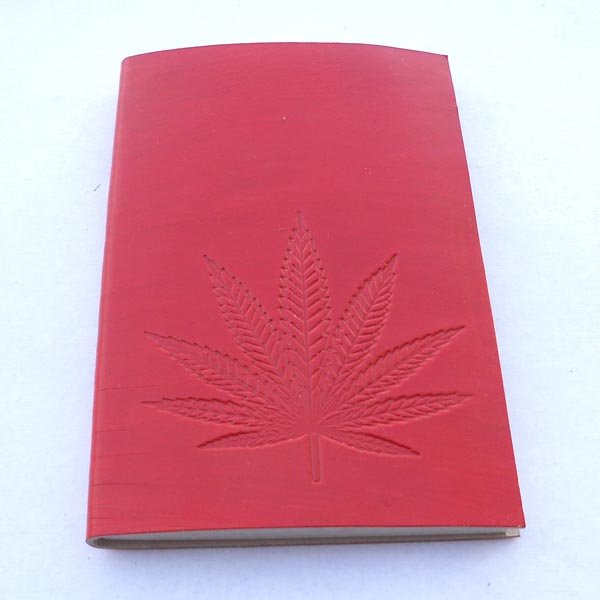 Hand bound goat leather journal in red color. Hand crafted journal with hemp leaf embossed on the front cover. Inside is 48 sheets / 96 pages of ‘Hemp Paper’ in natural shade of 70 GSM. Excellent paper to write upon which never bleeds with ink or even in painting! Truly recycled paper, handmade paper, wood free paper – with Ph level 7 or higher – its an acid free paper too!