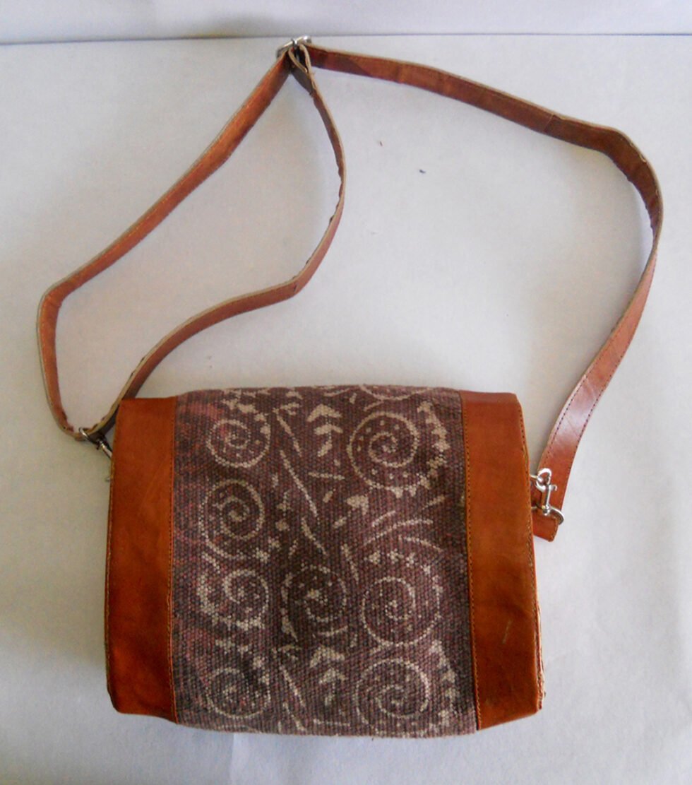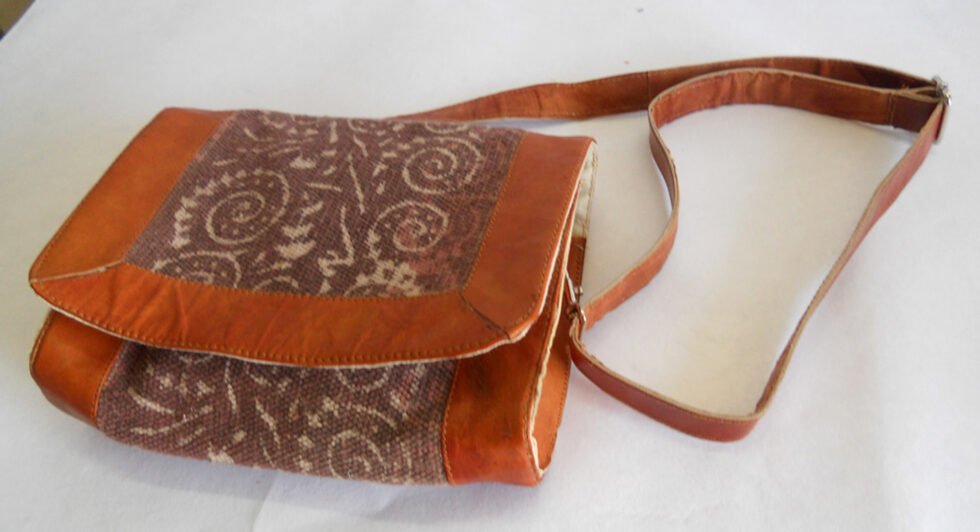 Hand woven cotton kelim / dhurries hand bag with genuine leather used decoratively at the edges as piping. Inside is cotton fabric lining. For closure, a touch button is given. Tu rely ethnic product from the cottage industry of Thar Desert of Western India, Rajasthan.