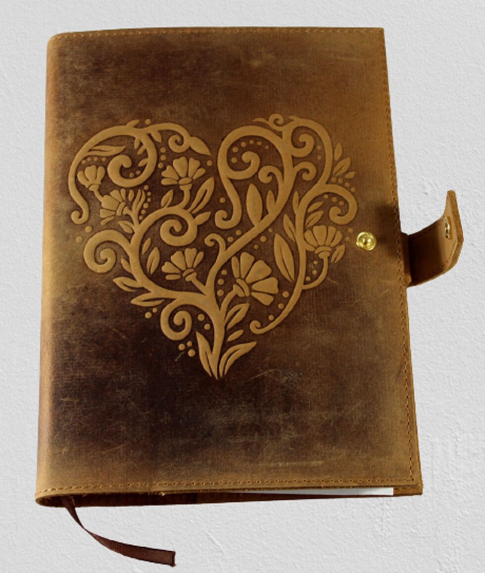 Genuine supple tobacco natural buffalo leather journal with 100 sheets / 200 pages of mill made line print paper. A refillable journal once the inside papers are fully used up – as we do provide the same insert. Inside the front cover, a pocket for credit cards is give. Front cover is bearing embossed ‘heart’ designs with hot stamping. At the back cover inside, a pen loop is provided with a small leather flap closure to protect the sheets inside. This journal is a special gift and a different kind of exclusive corporate gift!