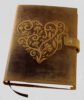 Genuine supple brown buffalo leather refillable journal with 100 sheets (200 pages) of lined mill-made paper. Features a front pocket for cards, embossed heart design, pen loop, and flap closure for protection. A unique and elegant corporate or personal gift!