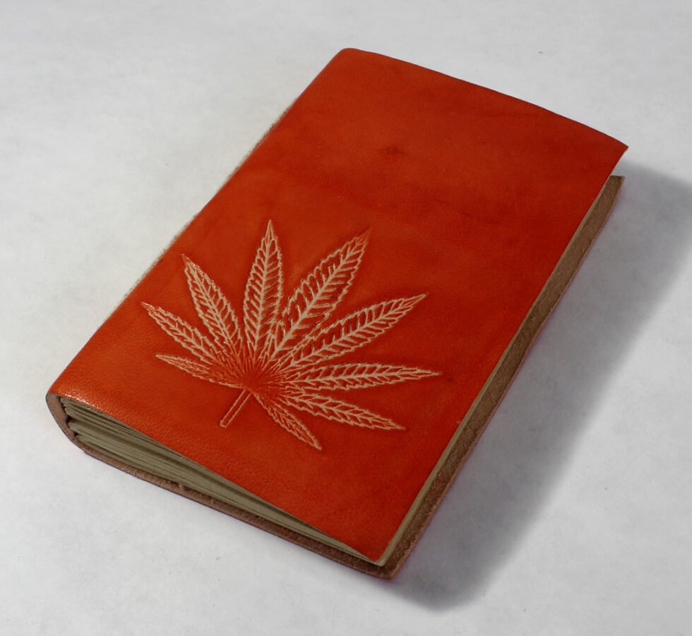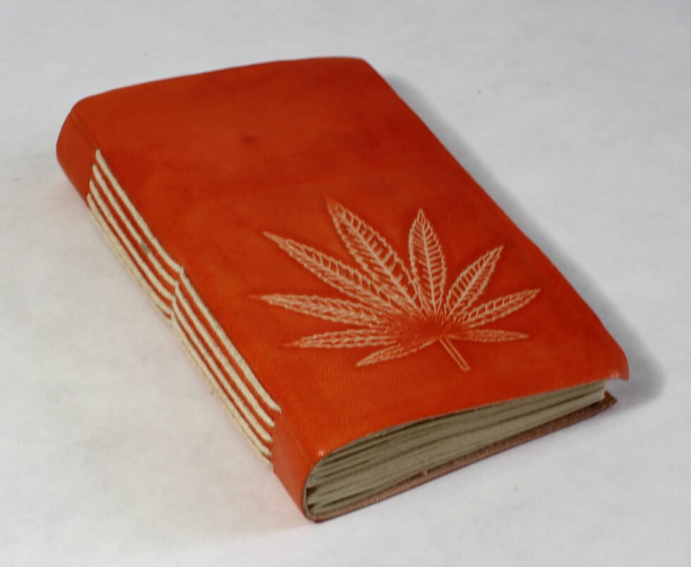 Orange colour genuine goat TC leather journal with a hemp leaf embossed on the front cover. Hard bound journal with100 sheets / 200 pages of recycled hemp paper. Excellent for writing, smooth wood free, acid free paper.