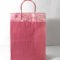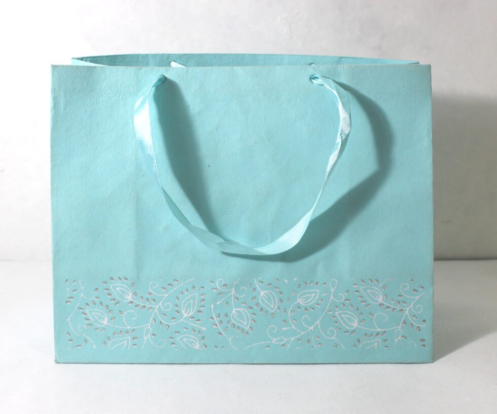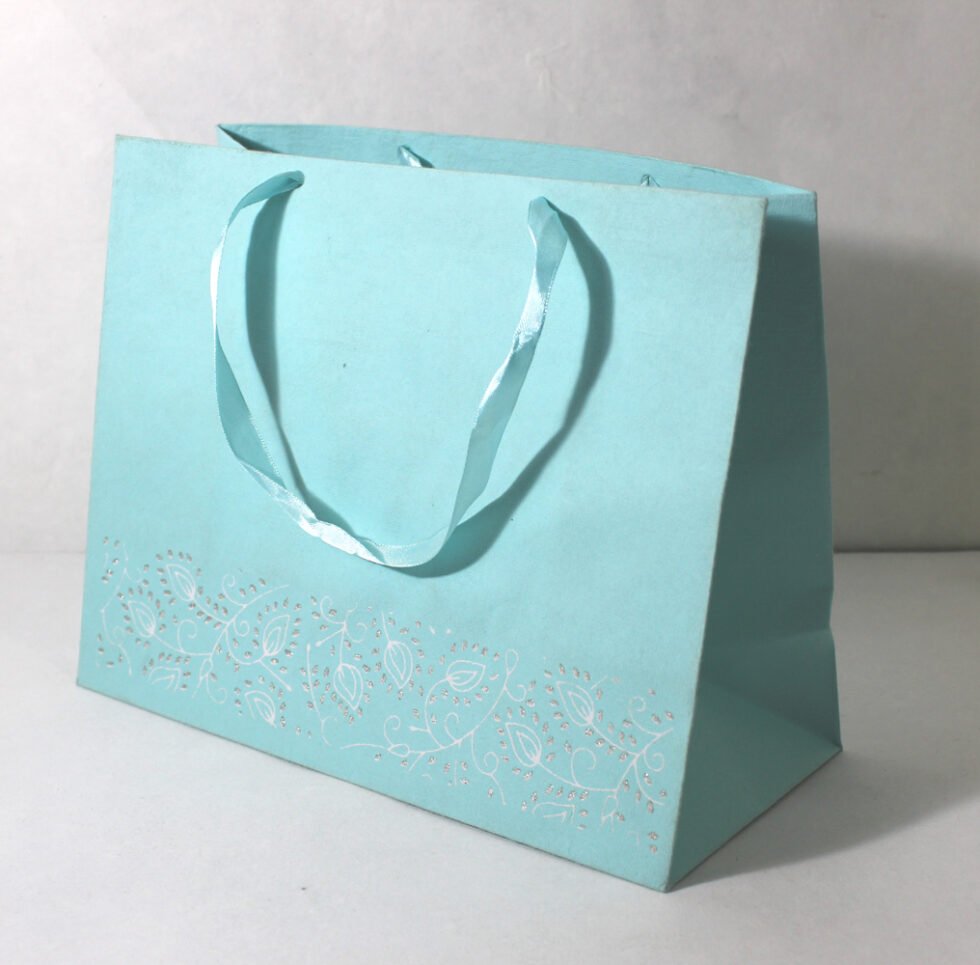 Recycled cotton handmade paper given glitter and ink print all over the bottom, while plain matching paper above that. Handles are matching satin ribbons. To strengthen up the collars and bottom, separate card sheets inside those are given.