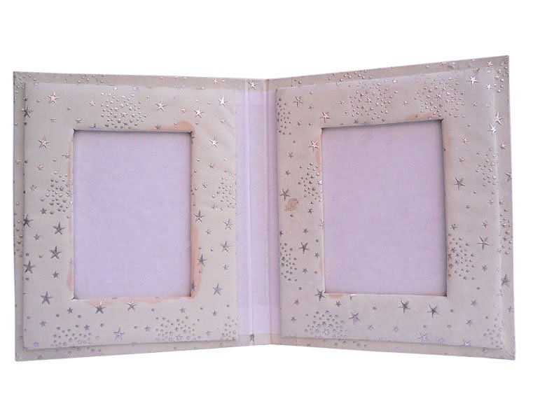 Photo frame made of recycled handmade cotton paper with Dew Drop metallic silver print all around it! Further, foam & cardboard is used to shape it up. A lovely ‘Green Life Style’ product for home decoration. Acetate is provided in the middle to protect photo.