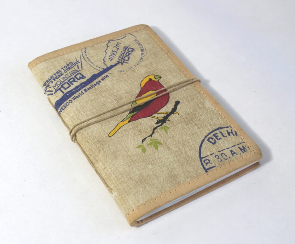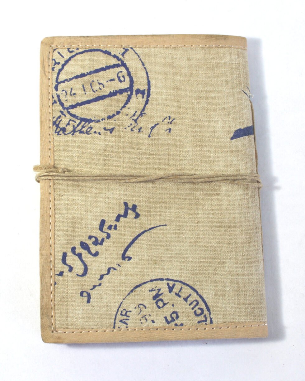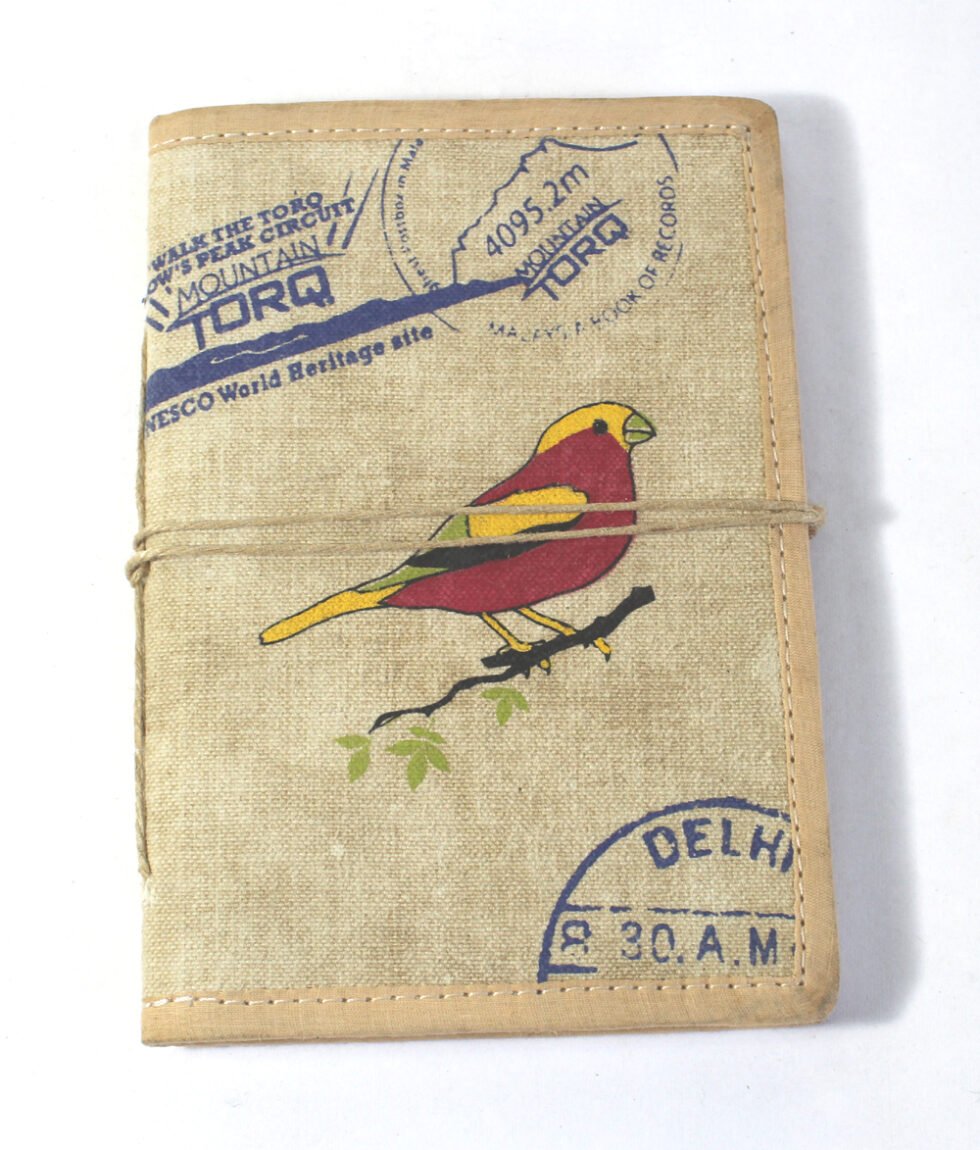 Soft cover antique canvas notebook with 48 sheets / 96 pages of handmade recycled cotton papers. Multi color bird being screen printed on the cotton antique finished canvas along with some old fashioned postal chops & stamps from various parts of the world, giving it a travel look. Can be a lovely travel journal as well as personal or corporate gift after some branding or given details / specifications.