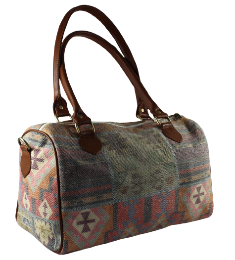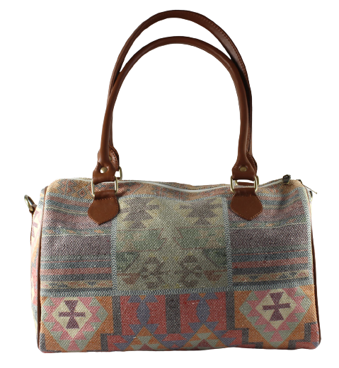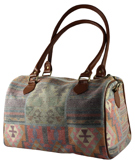 Handwoven cotton dhurry/kelim with Thar Desert patterns, lined with khadi cotton, multiple pockets for essentials, zipper closure, and faux leather piping & handle – vegan, strong, and ethnic.