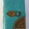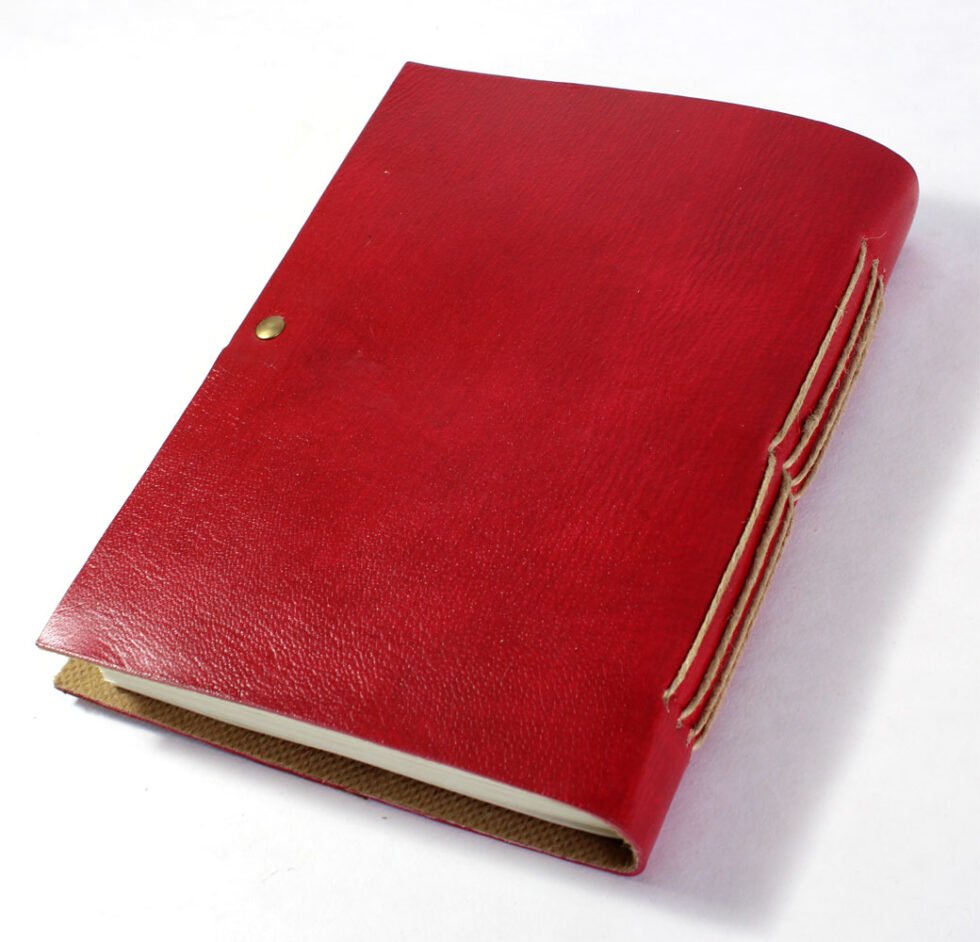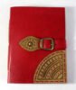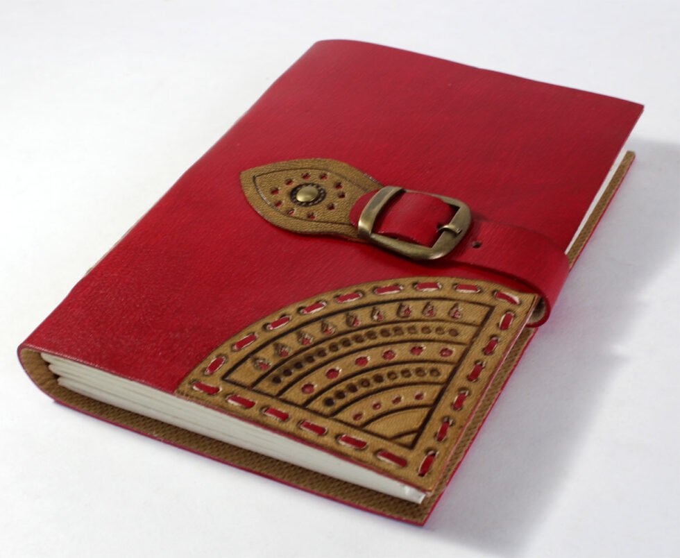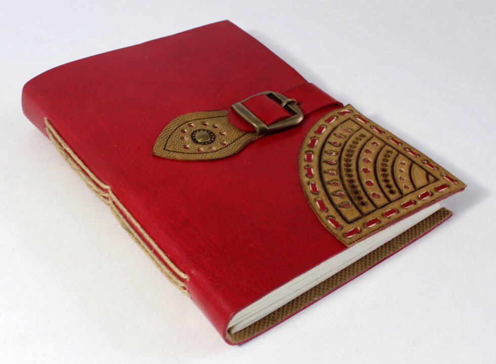 Hard bound genuine leather journal in red / gold color. Goat Tc leather with stenciled leather in gold color at the corner. With same matching a leather strap is given for a perfect closure. Inside are 72 sheets / 144 pages of recycled cotton plain paper – handmade.