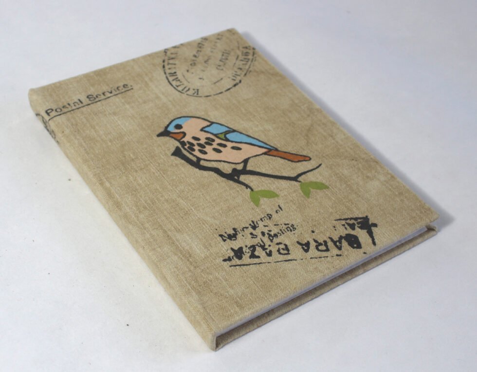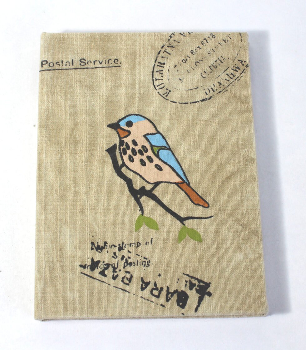 Hard cover antique canvas notebook with 48 sheets / 96 pages of handmade recycled cotton papers. Multi color bird being screen printed on the cotton antique finished canvas along with some old fashioned postal chops & stamps from various parts of the world, giving it a travel look. Can be a lovely travel journal as well as personal or corporate gift after some branding or given details / specifications.