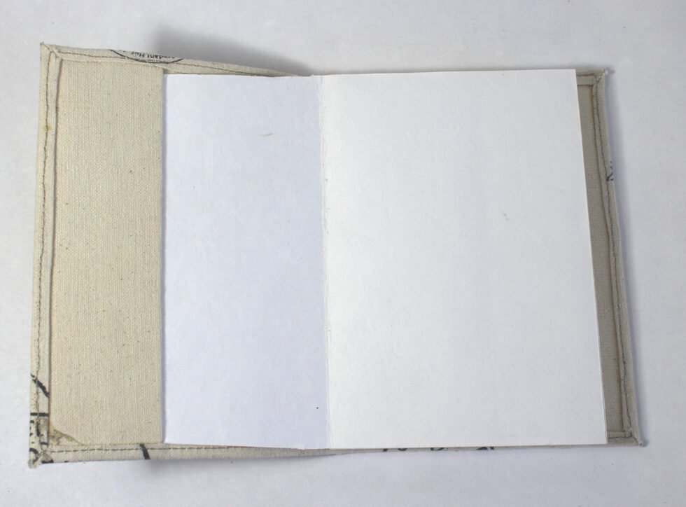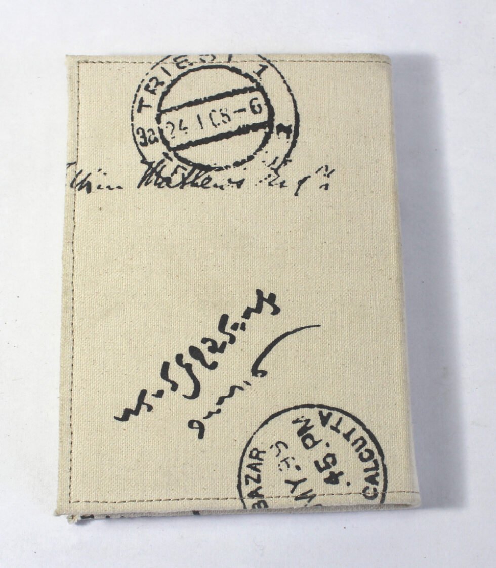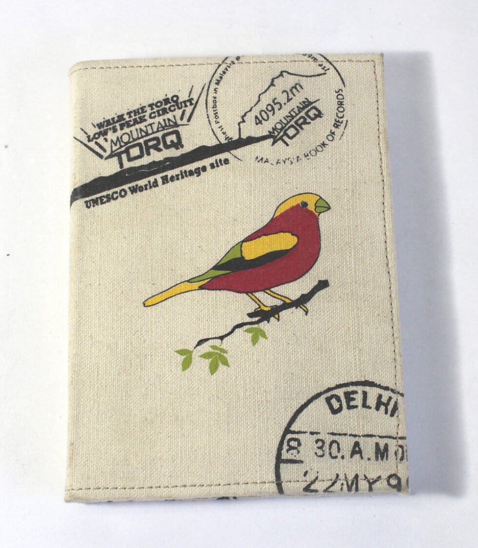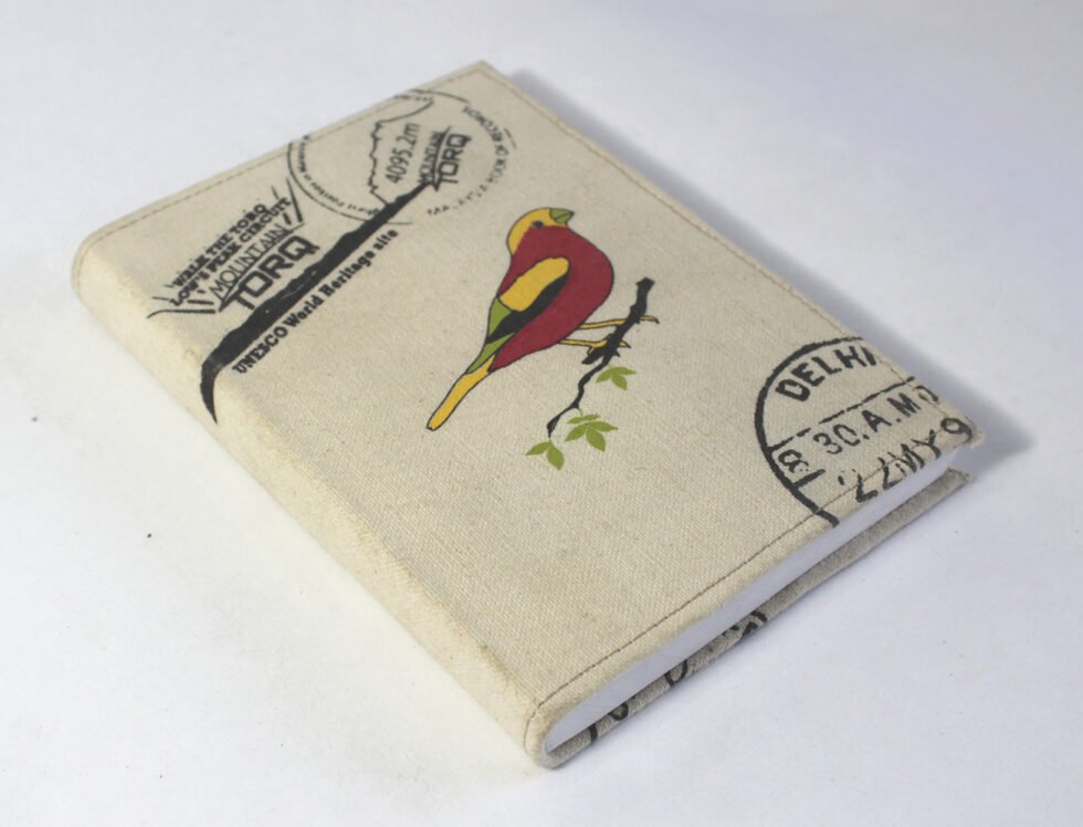 Hardcover refillable canvas notebook with 72 sheets / 144 pages of recycled cotton handmade papers. Multi colour bird being screen printed on the cotton canvas along with some old fashioned postal chops & stamps from various parts of the world, giving it a travel look. Can be a lovely travel journal as well as personal or corporate gift after some branding or given details / specifications.