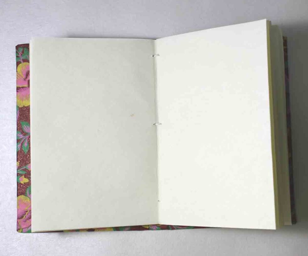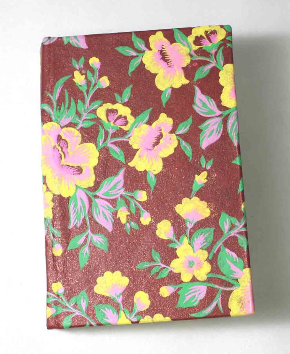 Handmade hand crafted notebook by premium artisans. Exclusive job work done on recycled handmade paper as cover. Inside, 48 sheets / 96 pages of cream color smooth paper. Lovely paper to write upon, totally wood free, acid free and never bleeds even when written upon by an ink / fountain pen. A beautiful hand crafted notebook with multiple prints / job works on cover paper to make it a beautiful present for many occasions.