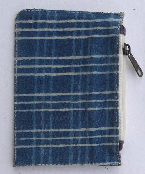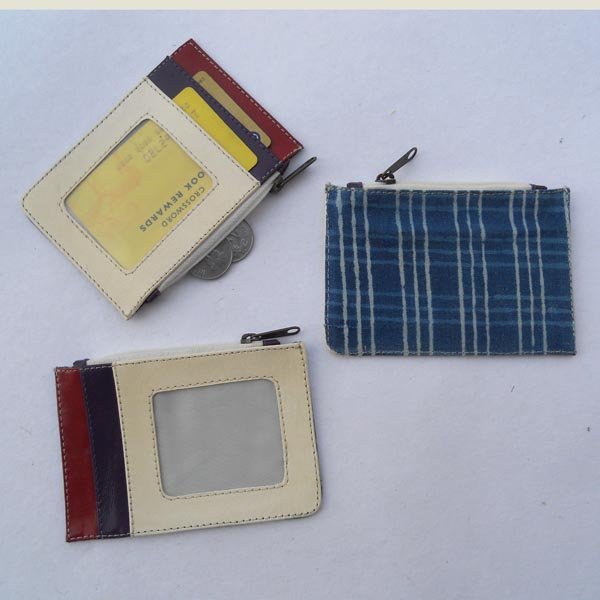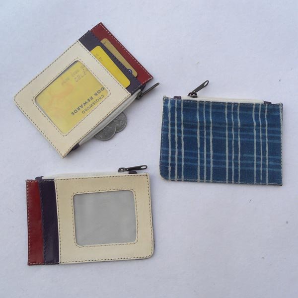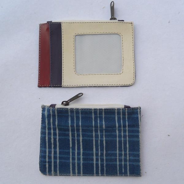 White leather on the front with multiple colour leather & pockets. At the back. Indigo batik printed cotton canvas.