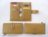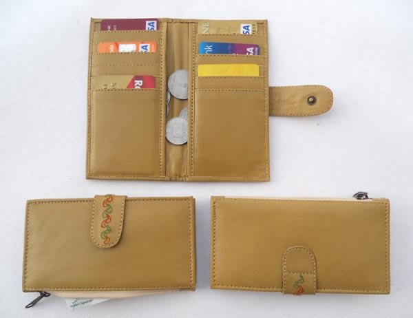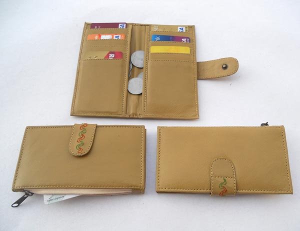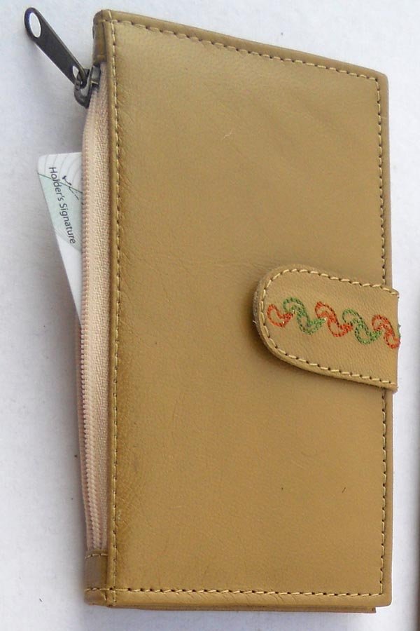 Khaki leather with multiple pockets for credit cards & two large side pockets for coins / documents. Fine embroidery on leather stripe for closure.