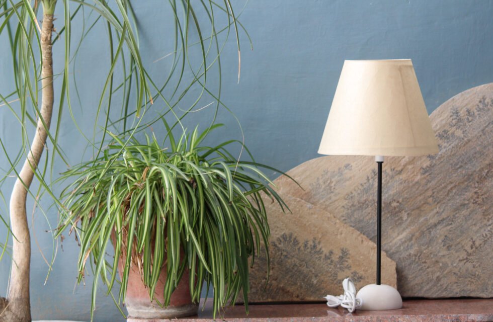 Lampshade from 100% banana fiber organic paper – purely recycled & handmade. A truly aesthetic décor catering to high class taste satisfying environmental concerns. Handcrafted by our premium artisans for the top quality international markets. A thin lining of acetate is given underneath the paper for the durability of the shade! The light shimmering out is so unique and carries a classy theme for any type of room / balcony / garden & bar. Tiny incursions of the dyed banana fiber and the colorful paper release spectacular light around. Shade supported by a thin wrought iron pipe as stand. On the top is the standard bulb holder while for the base there is sturdy white high quality marble 0.750 kg stone in oval shape! The lamp looks stunning yet simple – a wonderful handcrafted piece for elegant décor. A 2 meter long wire is given to its sturdy marble base with on / off switch facility.