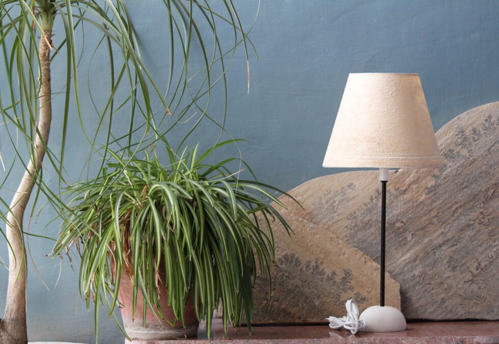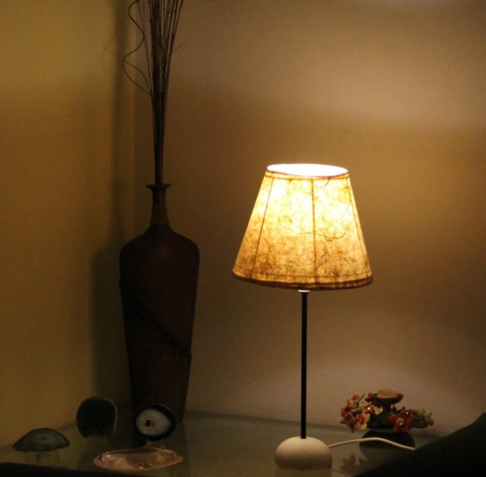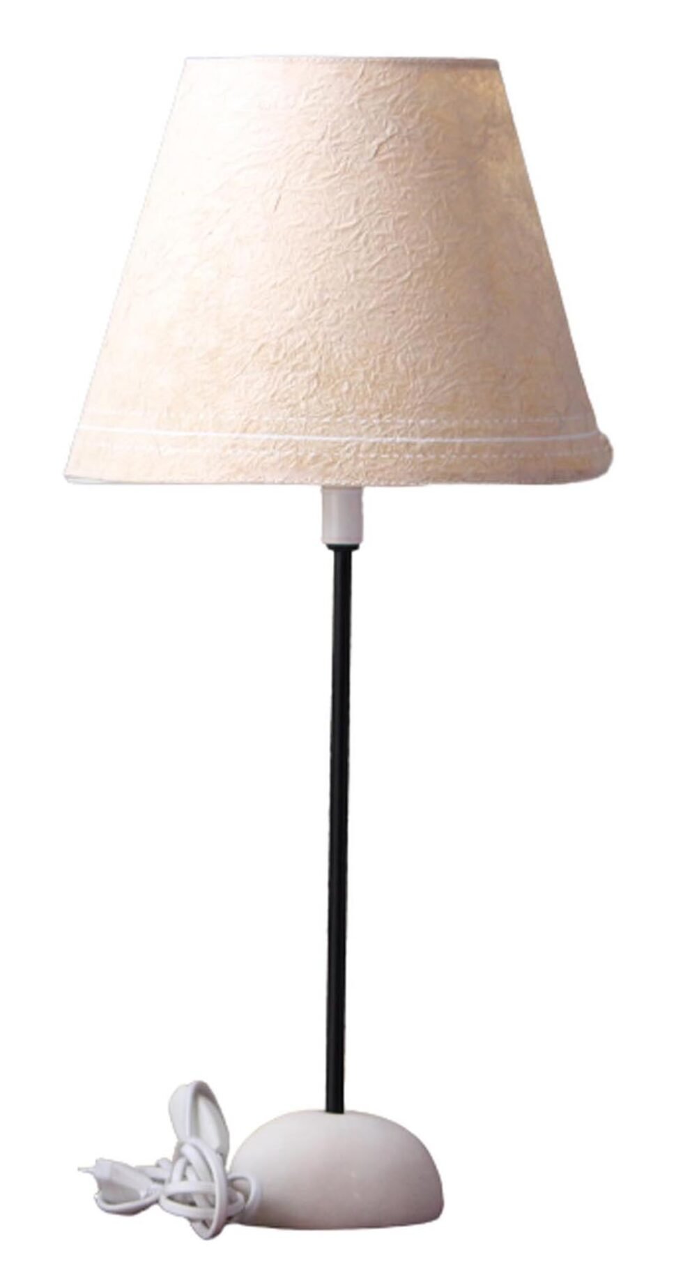 “Lampshade from 100% Lokta fiber organic paper – purely recycled & handmade. A truly aesthetic décor catering to high class taste satisfying environmental concerns. Handcrafted by our premium artisans for the top quality international markets. A thin lining of acetate is given underneath the paper for the durability of the shade! The light shimmering out is so unique and carries a classy theme for any type of room / balcony / garden or a bar. Tiny incursions of the dyed or natural Lokta fiber and its paper is having ancient Buddhist / Himalayan history and release spectacular light around. Shade supported by a thin wrought iron pipe as stand. On the top is the standard bulb holder while for the base there is sturdy white high quality marble 0.750 kg stone in oval shape! The lamp looks stunning yet simple – a wonderful handcrafted piece for elegant décor. A 2 meter long wire is given to its sturdy marble base with on / off switch facility.