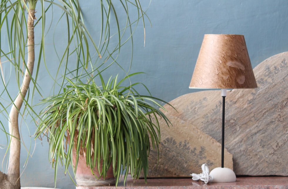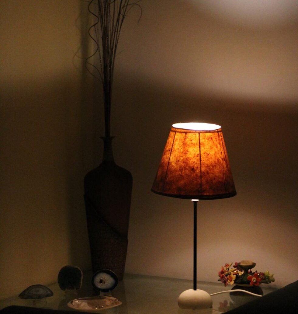 “Lampshade from cotton marble paper – purely recycled & handmade. A truly aesthetic décor catering to high class taste satisfying environmental concerns. Handcrafted by our premium artisans for the top quality international markets. A thin lining of acetate is given underneath the paper for the durability of the shade! The light shimmering out is so unique and carries a classy theme for any type of room / balcony / garden & bar. Light filtering out from the design pattern of the marble release spectacular formation of rays around. Shade supported by a thin wrought iron pipe as stand. On the top is the standard bulb holder while for the base there is sturdy white high quality marble 0.750 kg stone in oval shape! The lamp looks stunning yet simple – a wonderful handcrafted piece for elegant décor. A 2 meter long wire is given to its sturdy marble base with on / off switch facility.