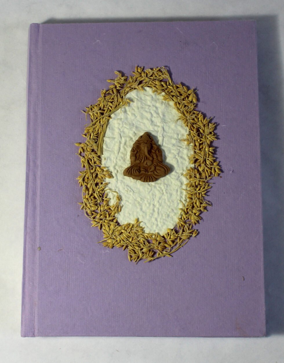 Beautiful collage design by gluing down a special paper in oval shape known as ‘Moon Rock’ on the front cover of the notebook. Further surrounded by the auspicious white grass around its border. In the centre, Lord Ganesh – The God of wisdom & Wealth, is placed, making it a very unique Diwali Present! A beautiful aesthetically made symbolic Diwali Present, and very auspicious too, for someone you wish very special! Just inside both the covers, front and back, there is another thick cream colour wood free / acid free paper sheet layer, holding the inside writing pages gracefully. In the middle, 48 sheets / 96 pages for smooth writing which never bleed with the ink or in calligraphy and can be a lovely travel book / art and craft book or a book – keeping domestic accounts and other valuable notes & details.