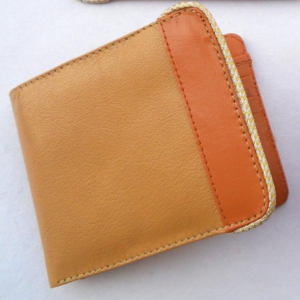 Light brown leather with & light orange leather with multiple pockets inside for multiple uses.