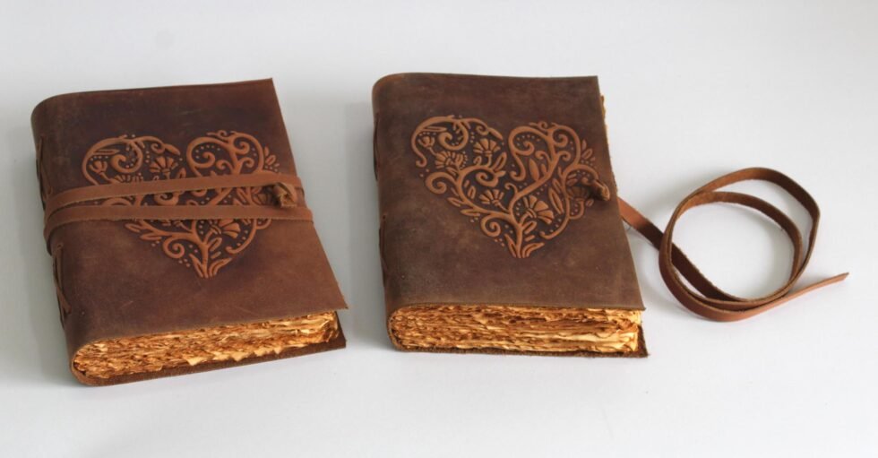 this lovely vintage journal Front cover is embossed with the heart design beautifully with the hot stamping. Draw, write and sketch to your heart’s content on the 120 vintage looking natural edged blank unlined sheets (or 240 pages) of recycled cotton handmade paper.