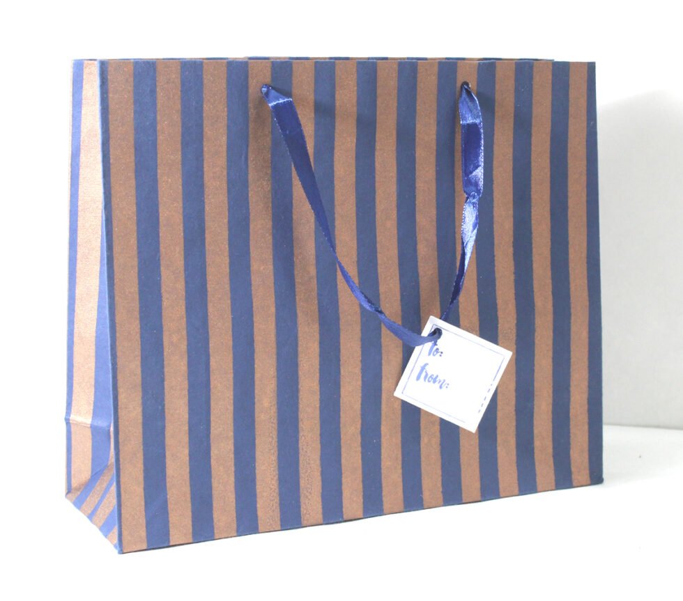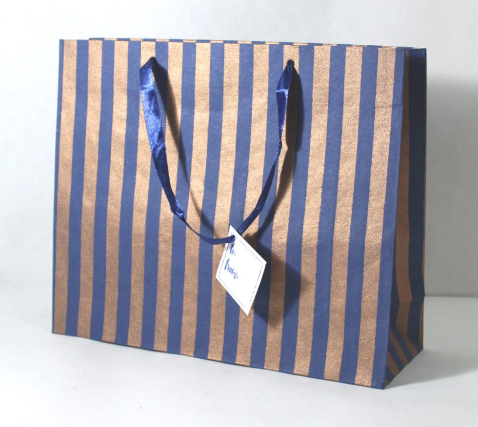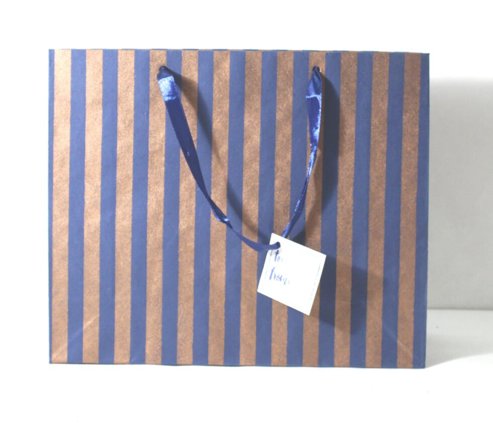 A lovely premium gift bag for exclusive use! Thick recycled cotton handmade paper with metallic copper spripes print all around. Matching satin ribbon handles are given with matching gift tag. Further, bottom and collars of the bags are strengthened up by providing card sheets inside.