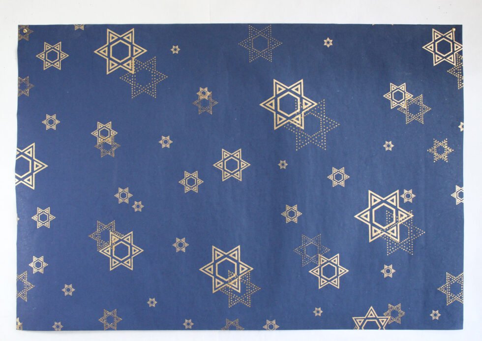 Metallic golden and glitter print on blue 100 GSM recycled cotton paper. Wood fee, acid free handmade paper. A premium gift wrap for all kind of occasions rolled up on a paper tube. Can be shipped flat also, double folded or just flat. Can be supported by other packing accessories like bags, boxes, tissue papers, tags & labels – a wonderful packing range in environment friendly paper. Can definitely be customized in terms of sizes, color, logo & other details.