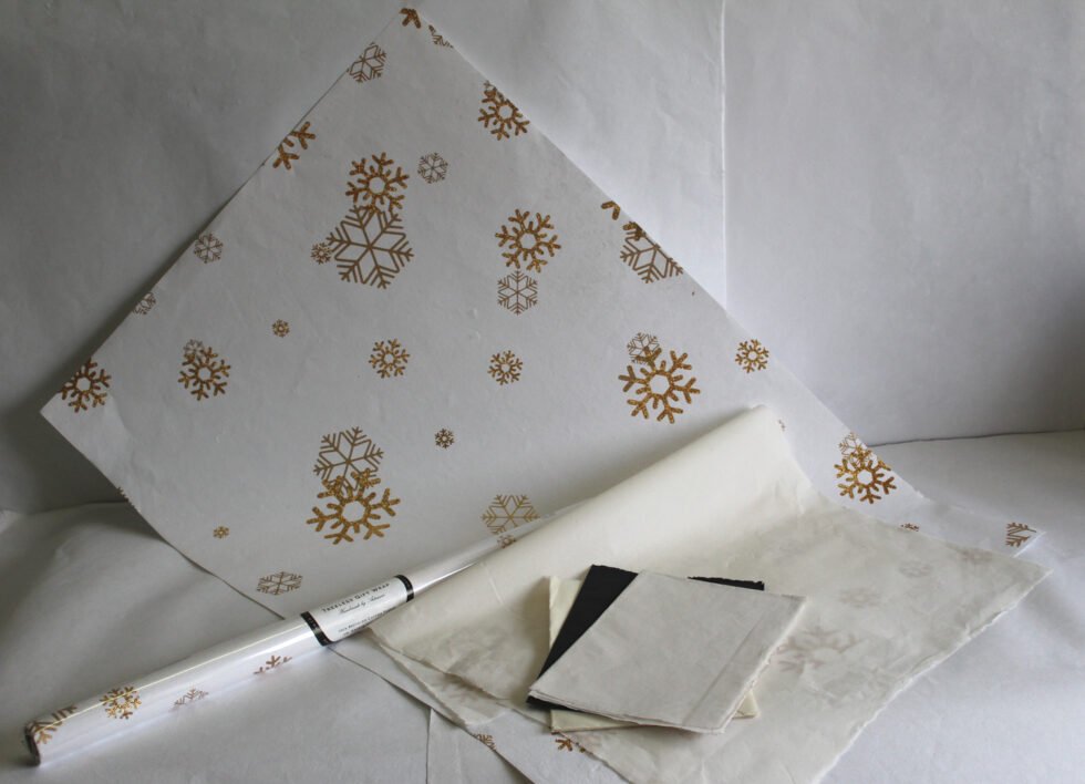 Metallic golden and sparkling golden print on white 100 GSM recycled cotton paper. Wood fee, acid free handmade paper. A premium gift wrap for all kind of occasions rolled up on a paper tube. Can be shipped flat also, double folded or just flat. Can be supported by other packing accessories like bags, boxes, tissue papers, tags & labels – a wonderful packing range in environment friendly paper. Can definitely be customized in terms of sizes, color, logo & other details.