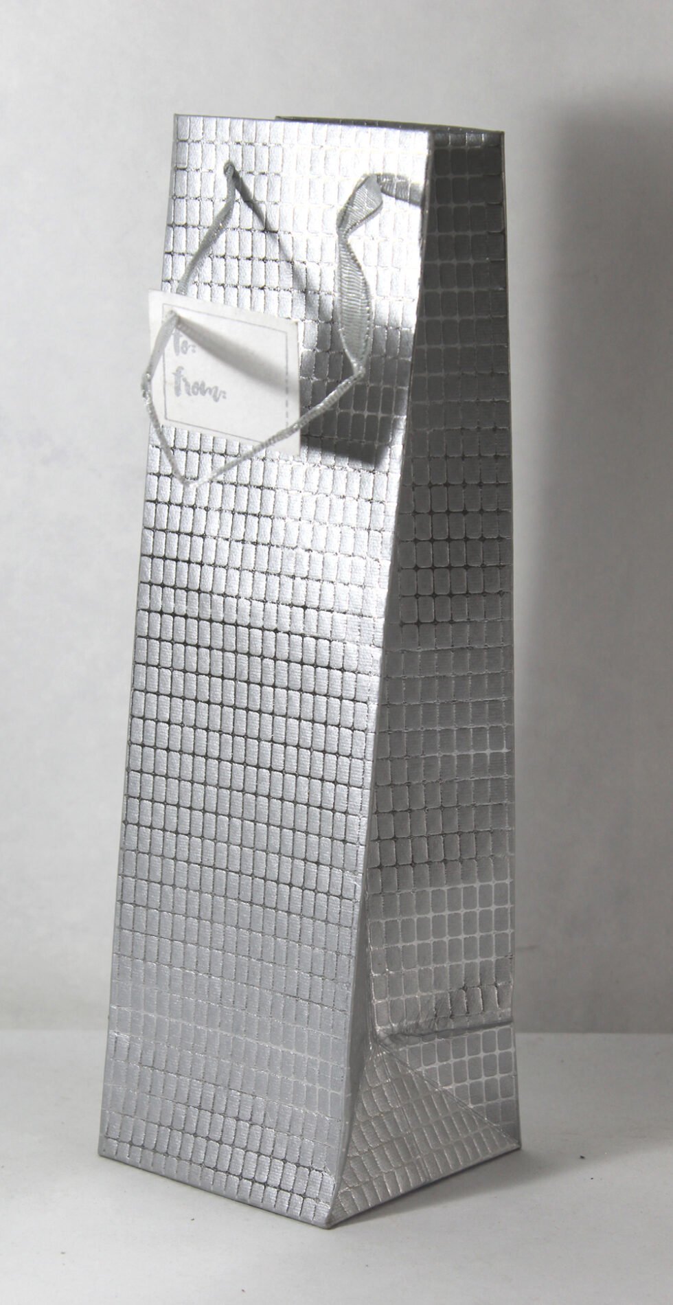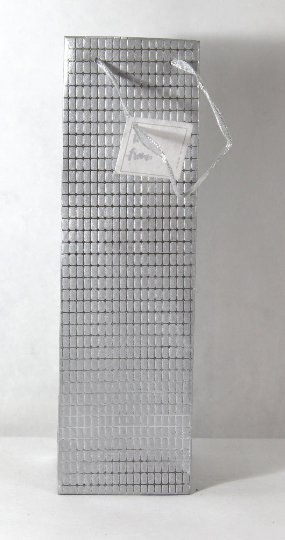 A lovely premium wine bag for exclusive use! Thick recycled cotton handmade paper with metallic silver base all around. Later on embossed and foil printed too all around in the forms of small checks. Matching satin ribbon handles are given with matching gift tag. Further, bottom and collars of the bags are strengthened up by providing card sheets inside.